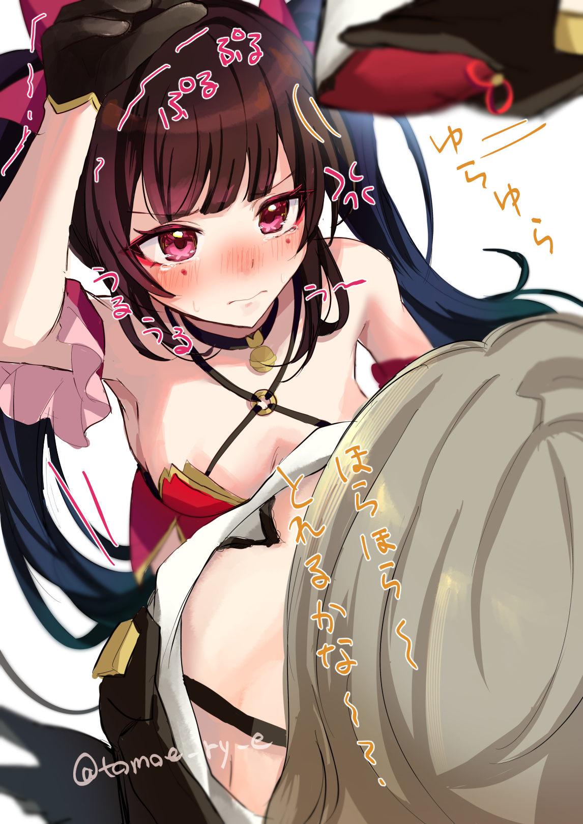 2girlsanger veinbare shouldersblack chokerblack glovesblushbreastsbrown hairchokercriss-cross halterdetached sleevesfrom aboveglovesgrey hairhalterneckholdingholding maskkeep-awaymark under both eyesmaskmultiple girlso-ringo-ring topred sleevesshirtsimple backgroundtearing uptremblingtwintailswhite backgroundwhite shirt