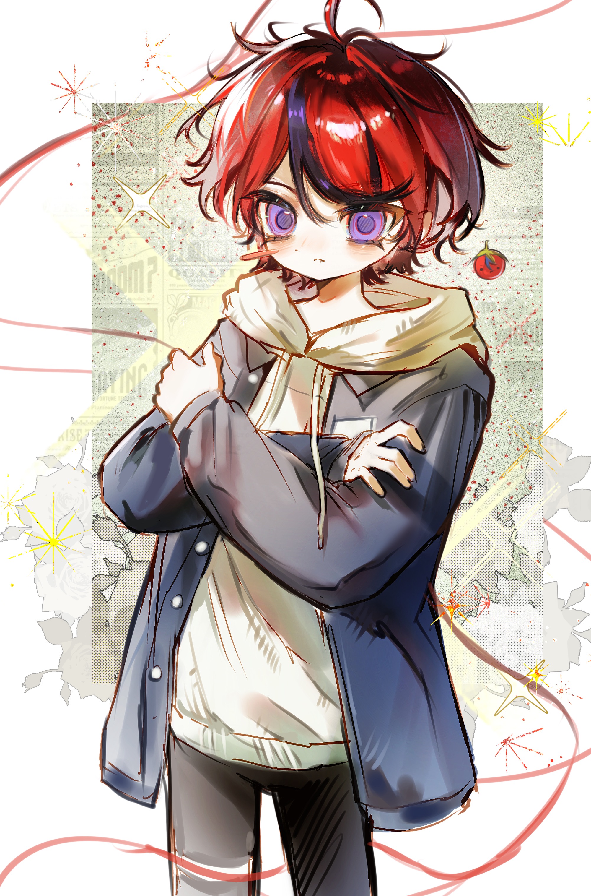 1boyahogeblack hairblack pantsblue jacketblushblush stickersclosed mouthcowboy shotcrossed armsdrawstringfangfang outfoodificationgrey jackethair between eyeshoodhood downhoodiejacketjacket over hoodielong sleevesmale focusmulticolored hairmulticolored jacketopen clothesopen jacketpantspurple eyesred hairshort hairsingle blush stickersleeves past wristssolostreaked hairthigh straptomatotsurimetwo-tone hairtwo-tone jacketwhite hoodieyanrenxi20831