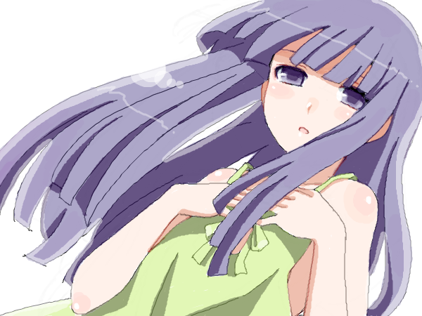 00s1girlbare shouldersblue eyesblunt bangscamisolefemale focushands on own chestpurple eyespurple hairsidelockssimple backgroundsoloupper bodywhite background