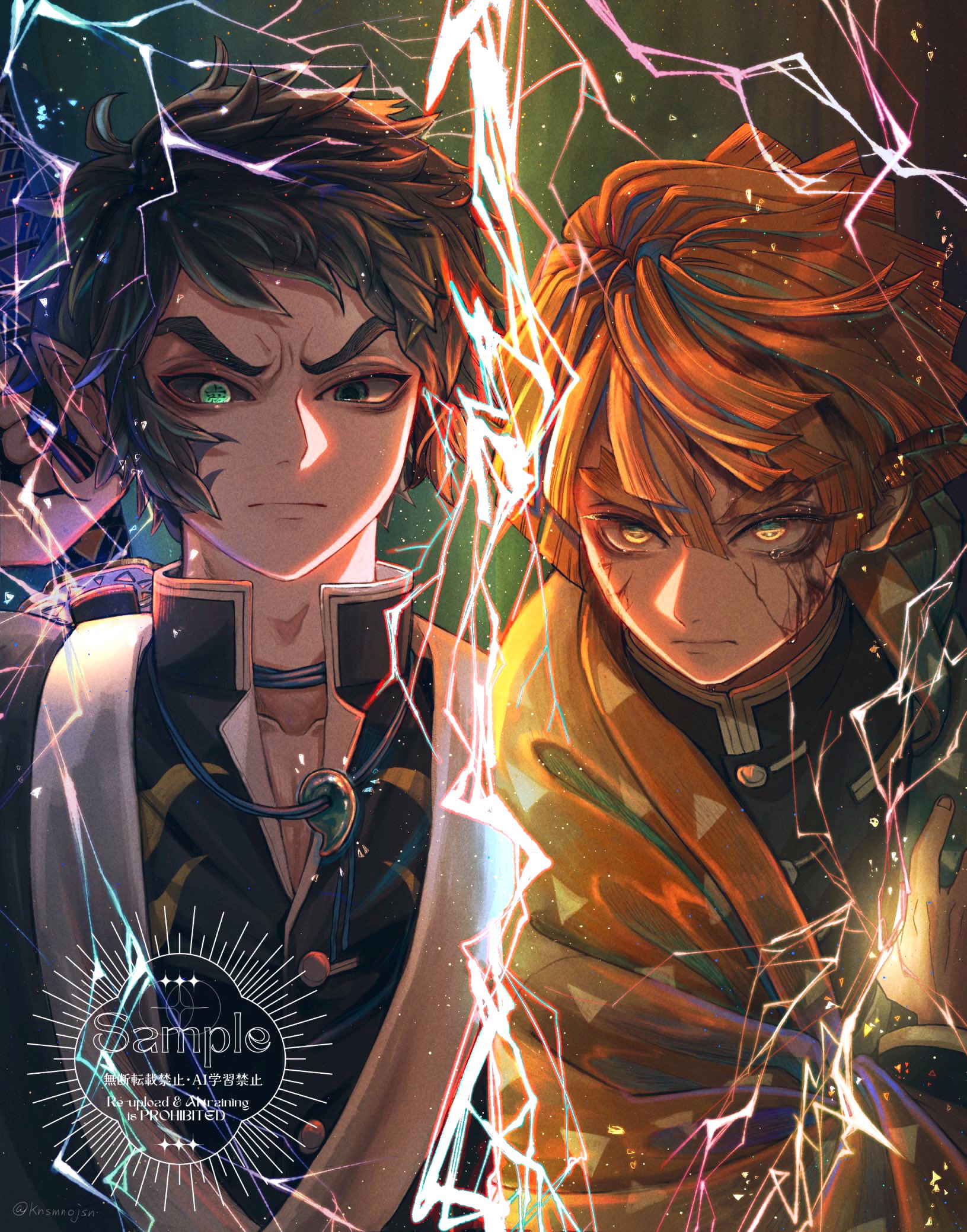 2boysblack hairblack jacketblack sclerablonde hairbloodblue eyesbuttonsclosed mouthcollarbonecolored scleracracked skindemon slayer uniformgold buttonsgreen eyeshaoriheterochromiahigh collarholdingholding swordholding weaponjacketjapanese clotheskatanaknsmnojsnmagatamamale focusmultiple boysshort hairspiked hairswordthundertriangle printweaponyellow eyesyellow haori