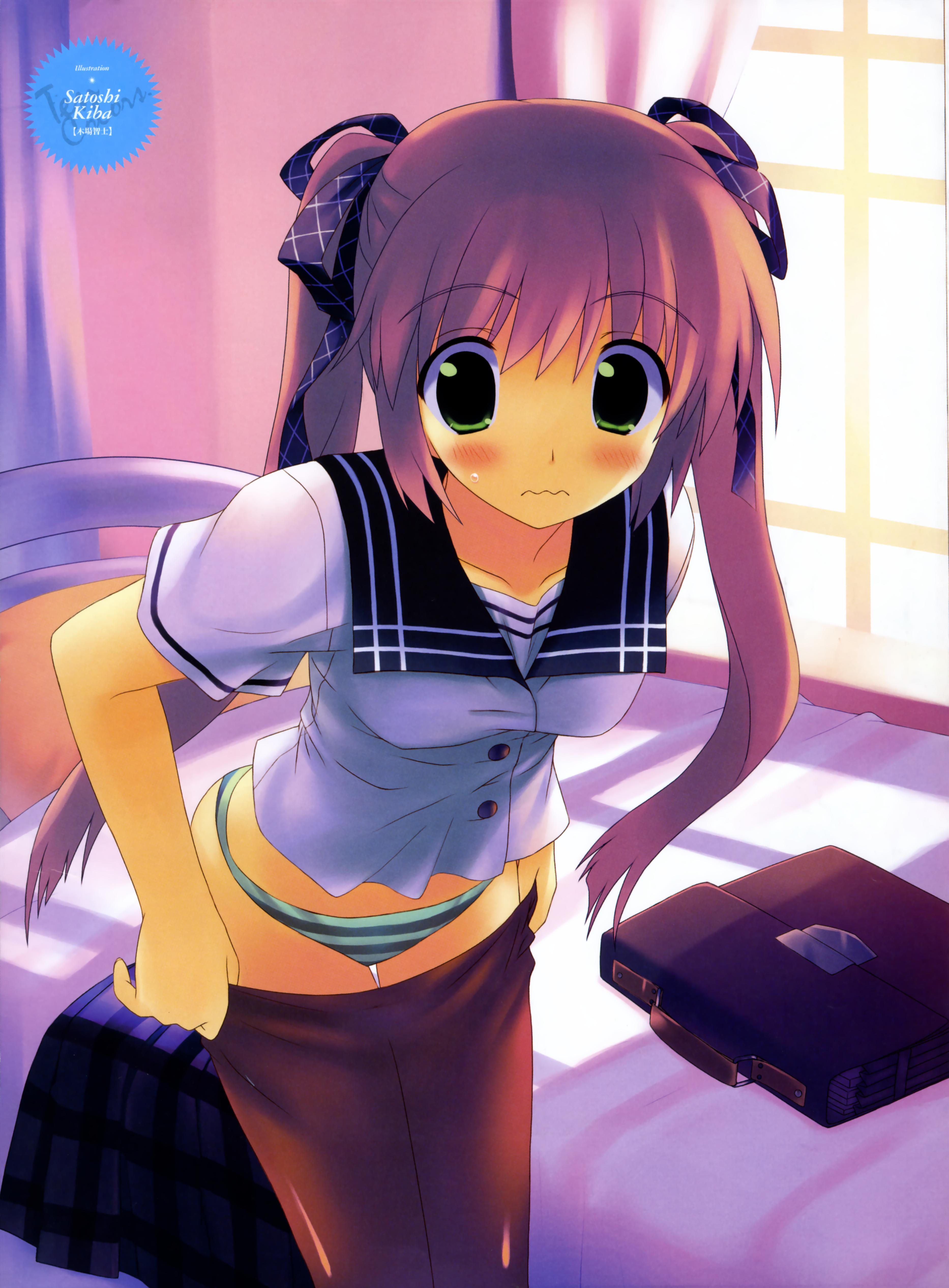 1girlbedblushfemale focusgreen eyeshair ribbonpantiespantyhosepink hairribbonschool uniformsolostriped clothesstriped pantiestwintailsunderwearundressingwavy mouth