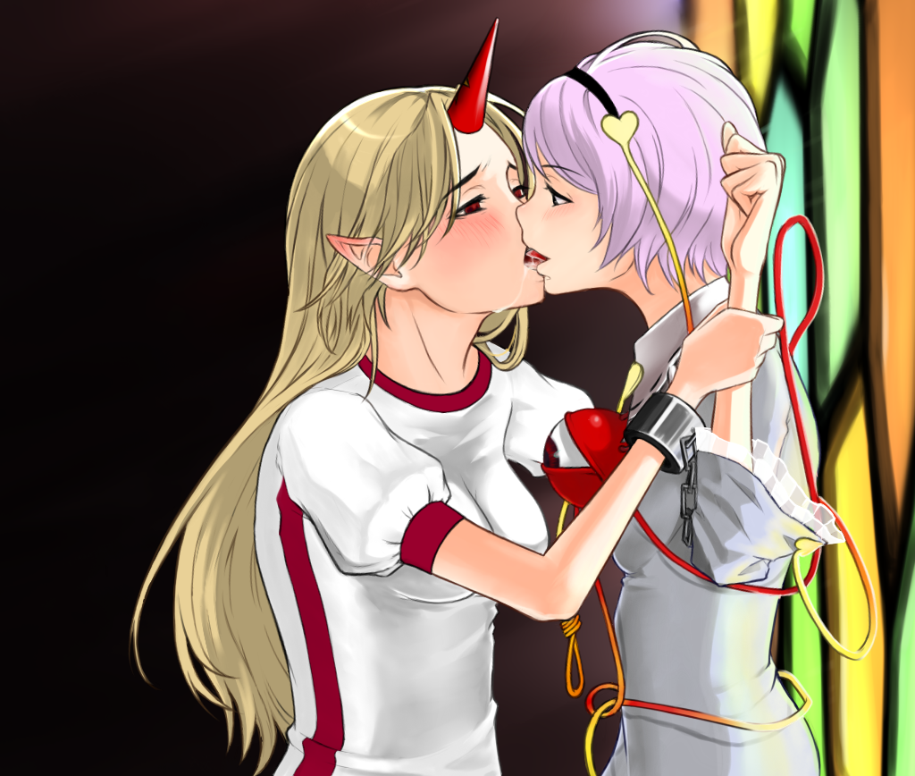 2girlsarm upblonde hairblushbreastsfemale focusfrench kisshornskissmultiple girlspointy earspurple eyespurple hairred eyessalivasingle hornstained glassyuri