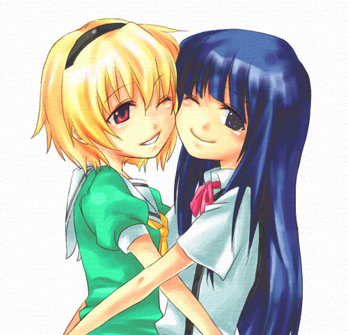 takahero, flandre scarlet, remilia scarlet, touhou, 2girls, alternate wings, blush, female focus, incest, kiss, multiple girls, siblings, sisters, wings, yuri