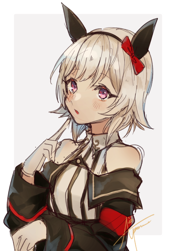 1girlanimal earsartist namebare shouldersblack hairbandblack jacketblushbowclothing cutoutear bowgrey hairhairbandhorse earsindex finger raisedjacketparted lipspurple eyesred bowshirtshort hairsignaturesimple backgroundsleevelesssleeveless shirtsolostriped clothesstriped shirtvertical-striped clothesvertical-striped shirtwhite backgroundwhite shirt