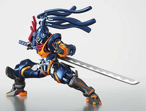 mutsumi masato, onigirikun, kyoudou senna, tenrou kunagi, dai (series), daibanchou, 2girls, arms up, back-to-back, blue eyes, blue hair, katana, leg lift, midriff, multiple girls, school uniform, serafuku, skirt, sword, thighhighs, weapon, white hair, white thighhighs, yellow eyes, zettai ryouiki