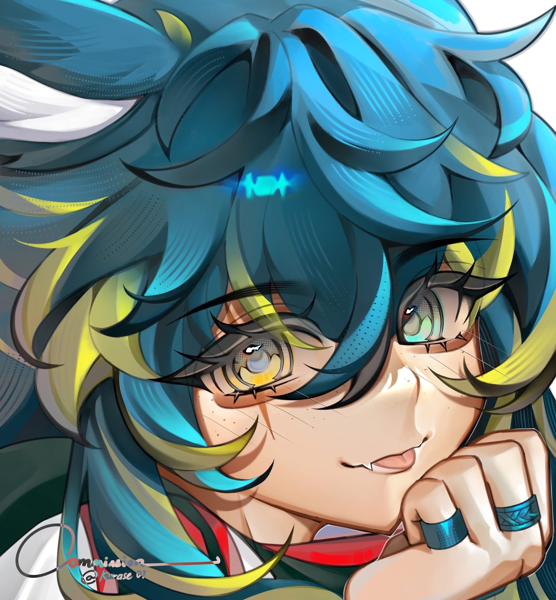1boyaegyo salblonde streaksblue eyesblue hairfanghair between eyesheterochromiajewelrylooking at viewermale focusmulticolored hairportraitringsimple backgroundskin fangsmilesolostreaked hairtonguetongue outwhite backgroundyellow eyes