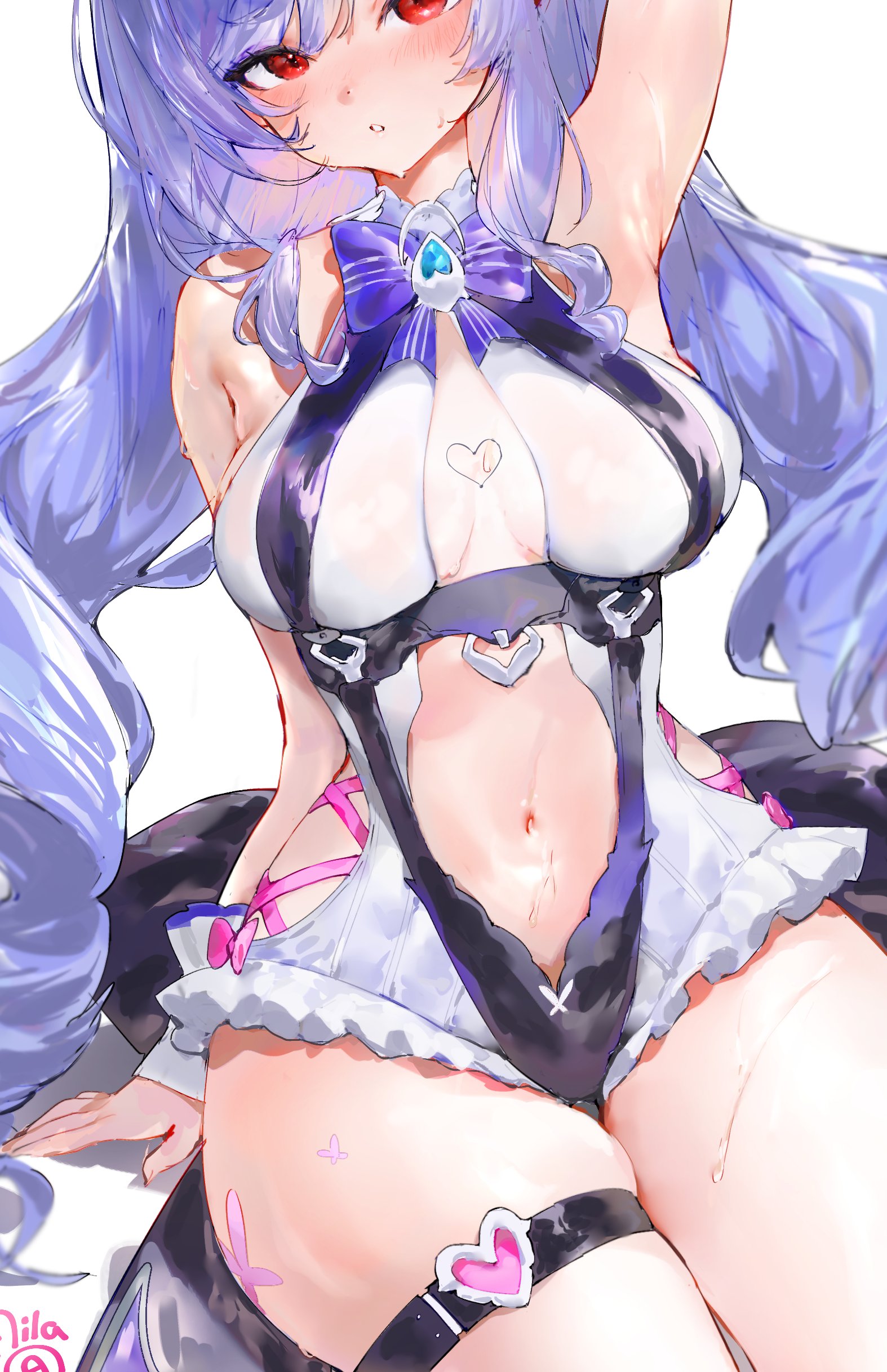 1girlarm uparmpitsblushbowbowtiebreastsbreasts apartclothing cutoutcowboy shotlong hairlooking at viewermedium breastsofficial alternate costumeparted lipspointy earspurple bowpurple bowtiepurple hairred eyessimple backgroundsolostomachstomach cutoutswimsuitthigh strapthighsvery long hairwetwhite background