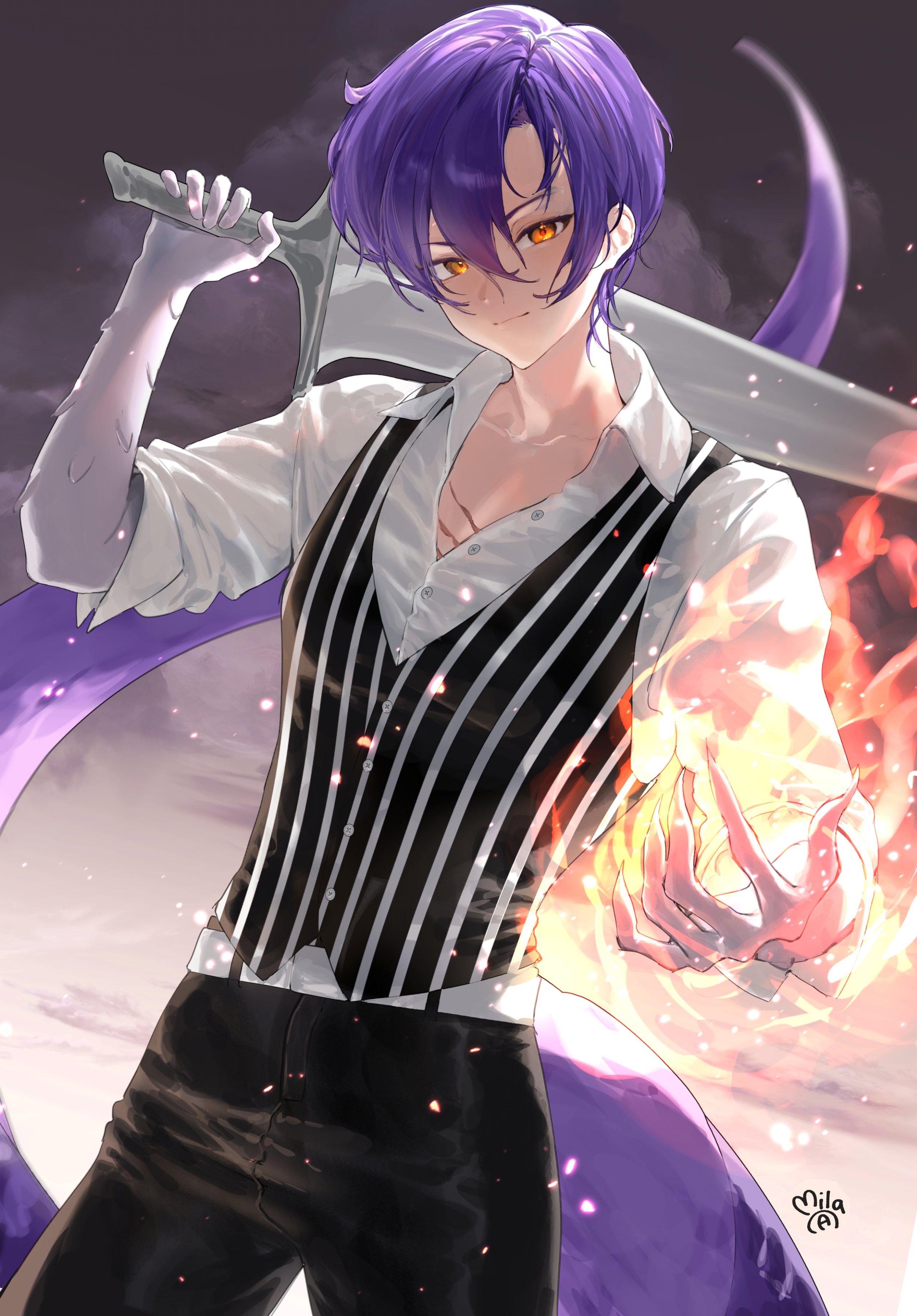 1boyblack pantsblack vestclosed mouthcollared shirtcowboy shotdragon boydragon tailfireflaming handhair between eyesheterochromiaholdingholding swordholding weaponlong bangslooking at viewermale focusorange eyespantspurple hairpyrokinesisscalesscarscar on chestshirtshort hairsignaturesleeves pushed upsmilesolostriped clothesstriped vestswordtailvertical-striped clothesvertical-striped vestvestweaponwhite shirtyellow eyes