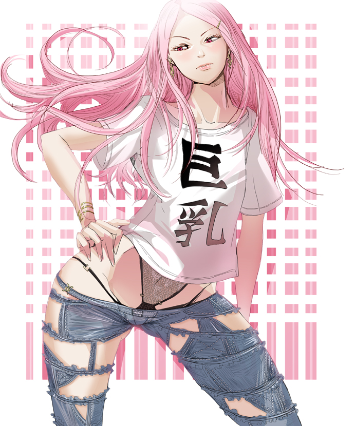 00s1girlblonde hairbraceletclothes writingdenimearringsfemale focusg-stringhair ornamenthaircliphand on own hiphip focusjeansjewelrylong hairpantiespantspink hairred eyesshirtsoloswimsuitswimsuit under clothest-shirtthongtorn clothestorn jeanstorn pantsunderwear