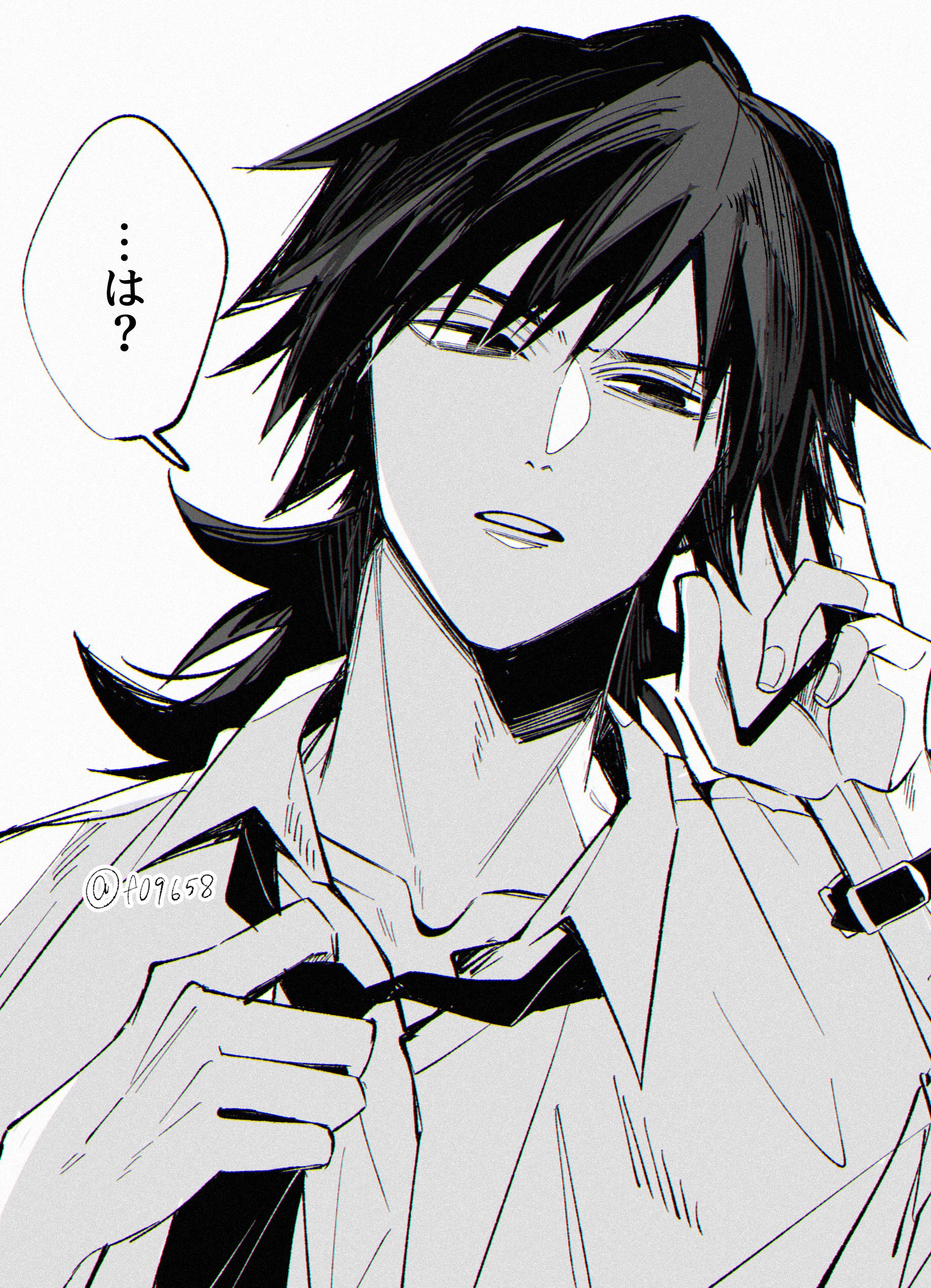 1boyalternate costumecellphonecollarboneempty eyesf09658fingernailsgreyscalehalf-closed eyeshand upholdingholding necktieholding phonemale focusmonochromeparted lipsphonesimple backgroundsmartphonesolospeech bubbleteethtwitter usernameupper bodywhite background