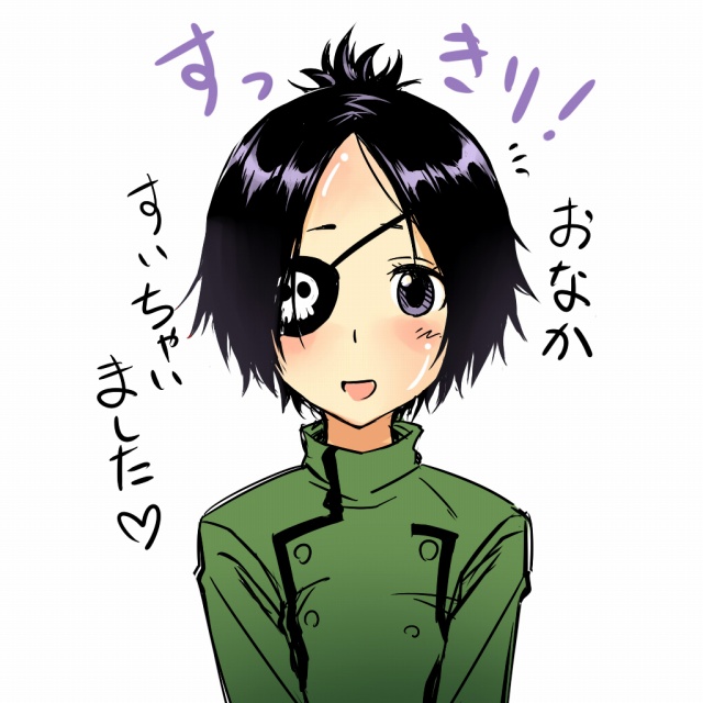 00s1girlblack hairblusheyepatchfemale focushappyshort hairsimple backgroundsolowhite background