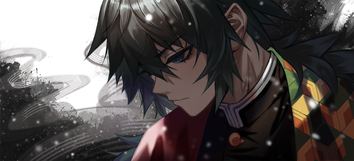 1boyblack hairblack jacketblue eyesbuttonsclosed mouthdemon slayer uniformempty eyesgold buttonshaorihigh collarjacketjapanese clotheskikkoumonlow ponytailmale focusponytailprint haorired haorisolospiked hairupper body