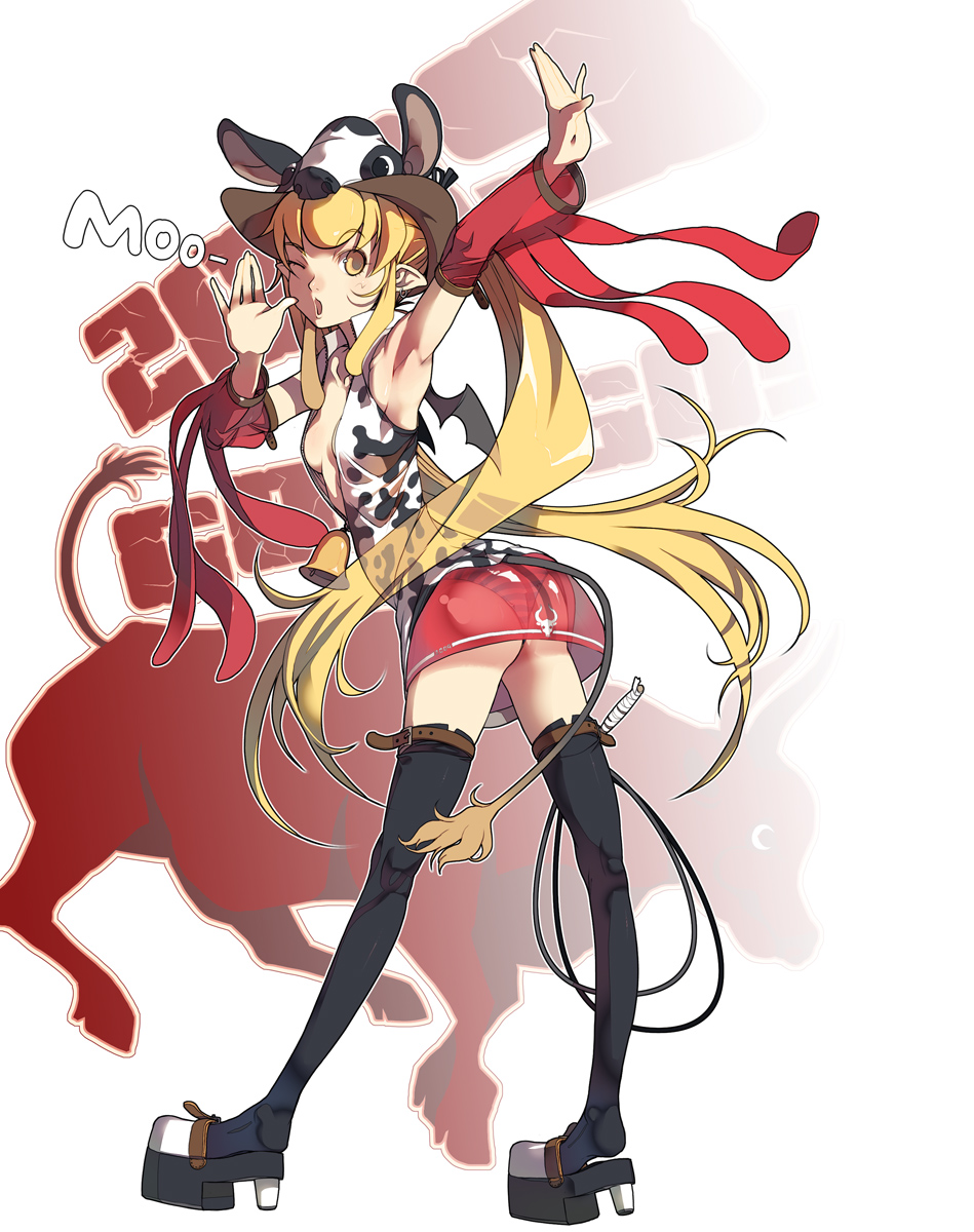 1girlanimal printarmpitsassblack thighhighsblonde haircow printcowboy hatcowboy westerndetached sleevesfemale focusfull bodyhatlegslong hairone eye closedpantiespointy earssee-through clothesskirtsolostandingstriped clothesstriped pantiestailthighhighsunderwearvery long hairwhipwink