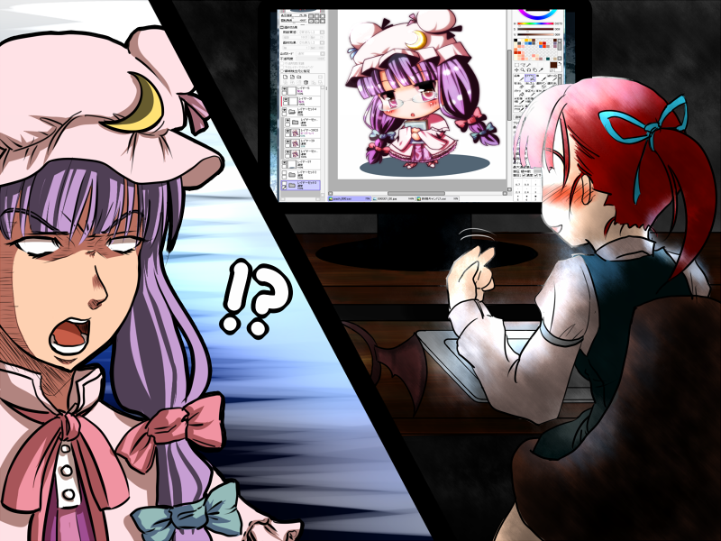 :d1boy2girlsalternate hairstylearm garterarmbandbespectacledblushbowchibicomputerfake wingsfemale focusglassesheadbandmonitormultiple girlsno wingsopen mouthpink bowponytailpurple eyespurple hairred hairribbonsmilevestwings