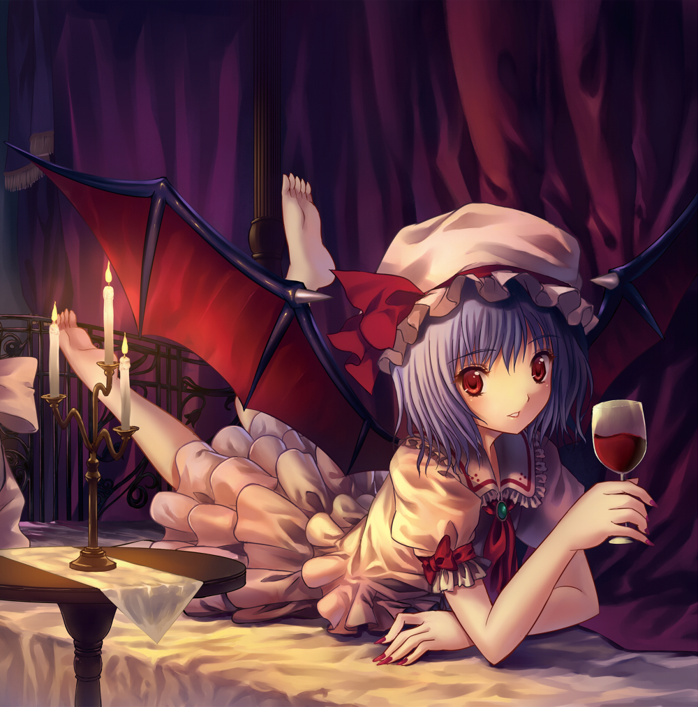 1girlbarefootbat wingsbedblue haircandelabracandlecandlestandcupdrinking glassfeetfemale focusfingernailshatlegs uplong fingernailslooking at viewerlyingnail (hardware)nail polishon stomachred eyesred nailsshort hairsmilesolovampirewine glasswings