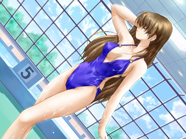 1girladjusting hairarm upbreastsbrown hairclosed eyescovered erect nipplesdutch angleindoorslong hairmedium breastso-ringo-ring swimsuitone-piece swimsuitpoolpoolsideprofileswimsuitv-neckwetwindow
