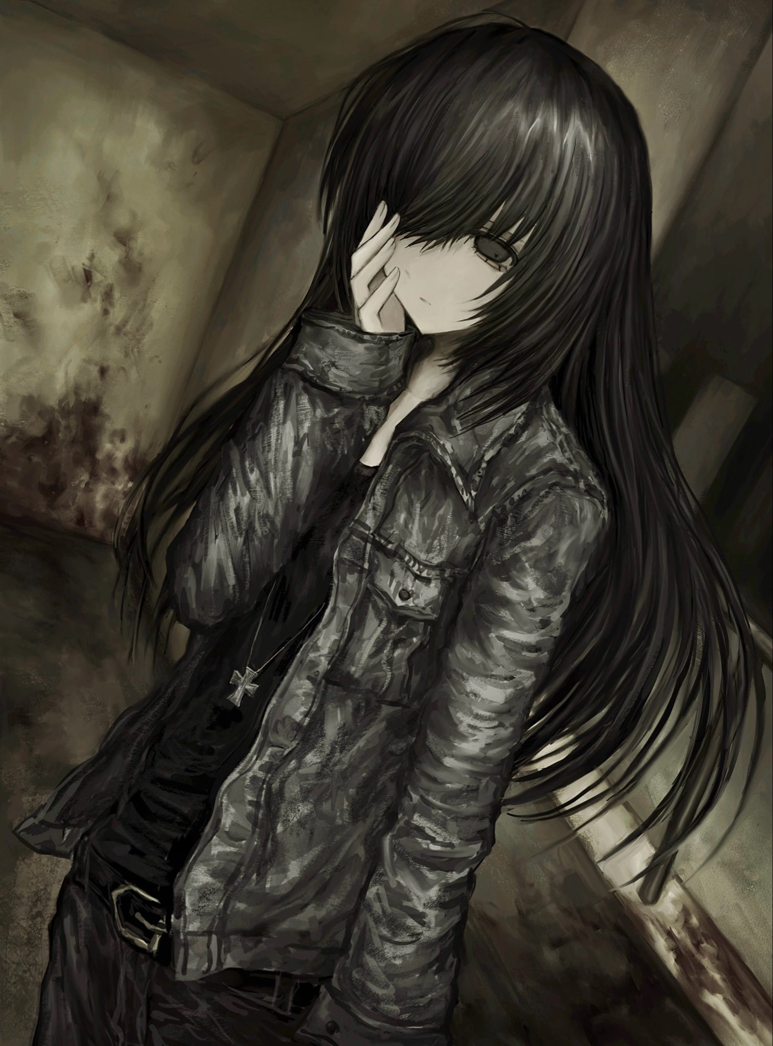 1girlbeltblack eyesblack hatblack pantsblack shirtbloodblood staincowboy shotcrosscross necklacedenimdenim jacketexpressionlesshair over one eyehand on own facehand uphatindoorsjacketjewelrylong hairlong sleevesmuted colornecklacepale skinpantsshirtsolostanding