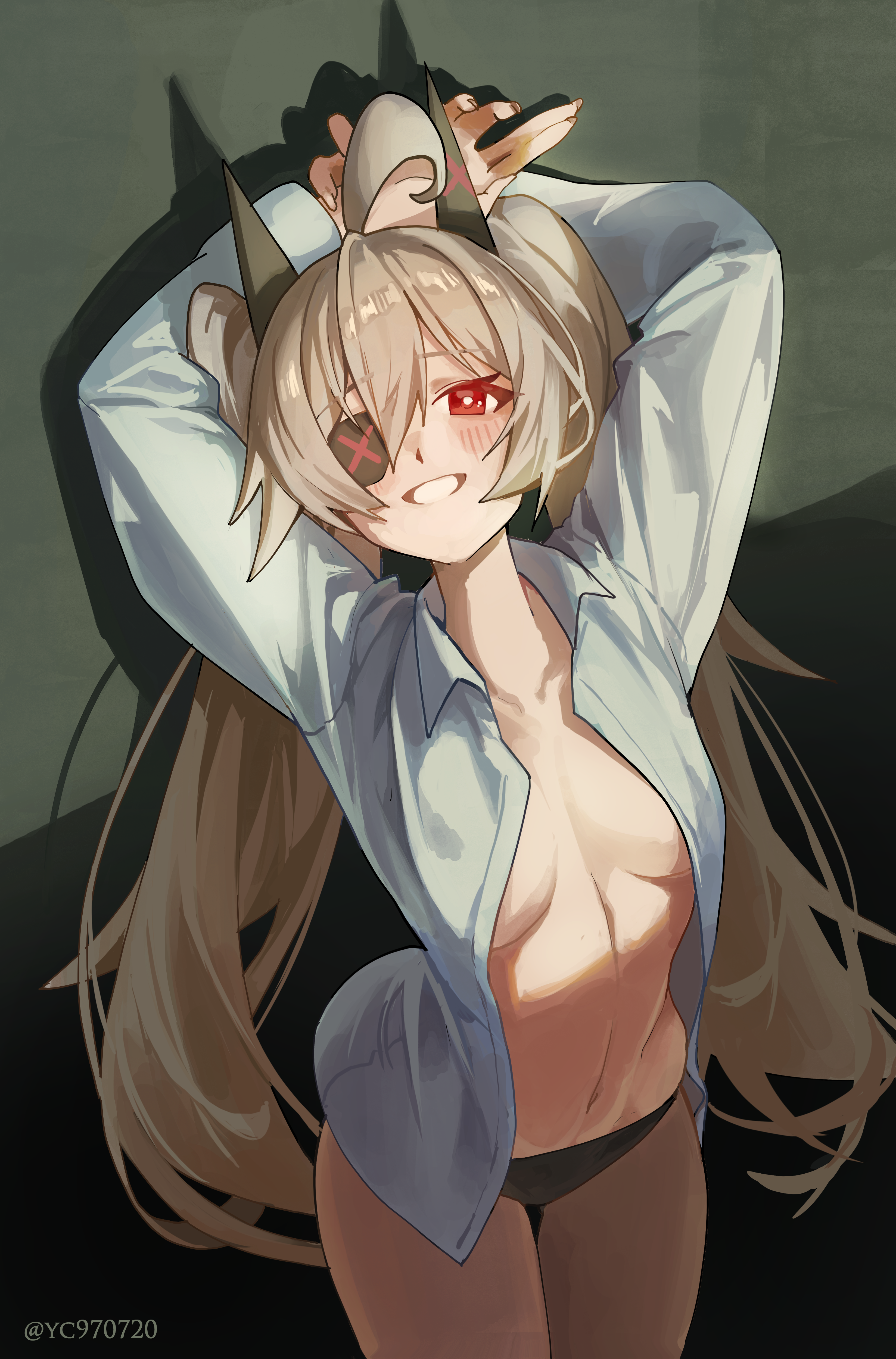 1girlarms behind headarms upblack hornsblack pantiesblushbreastsbrown haireyepatchhair between eyeshornslong hairlong sleeveslooking at viewermedium breastsnavelopen clothesopen shirtpantiesred eyesshirtsmilesolostandingthigh gapthighstwitter usernameunderwearvery long hairwhite shirt