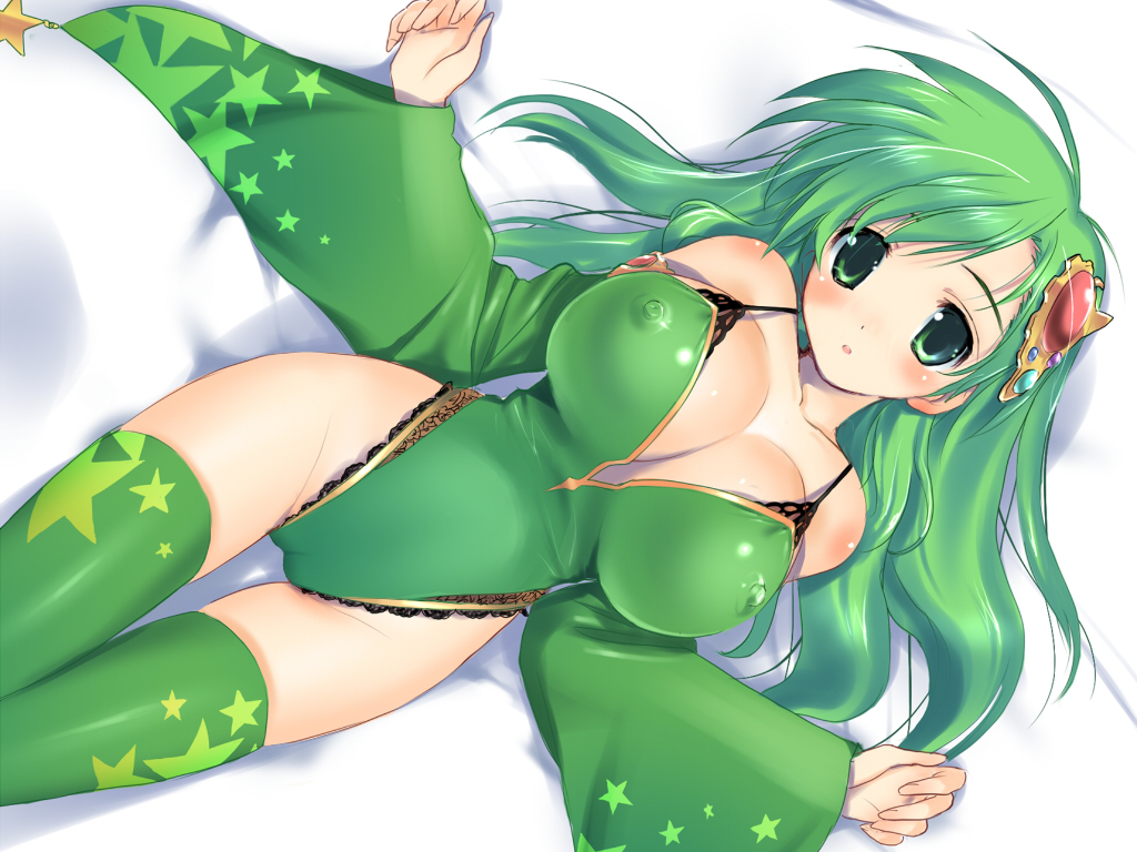 1990s (style)1girlaged upbare shouldersblushbreastscameltoecleavagecovered erect nipplesfemale focusgreen eyesgreen hairgreen themegreen thighhighshair ornamenthip focushuge breastsleotardlong hairlooking at viewerlyingmatching hair/eyeson backretro artstylesolothighhighswide hips