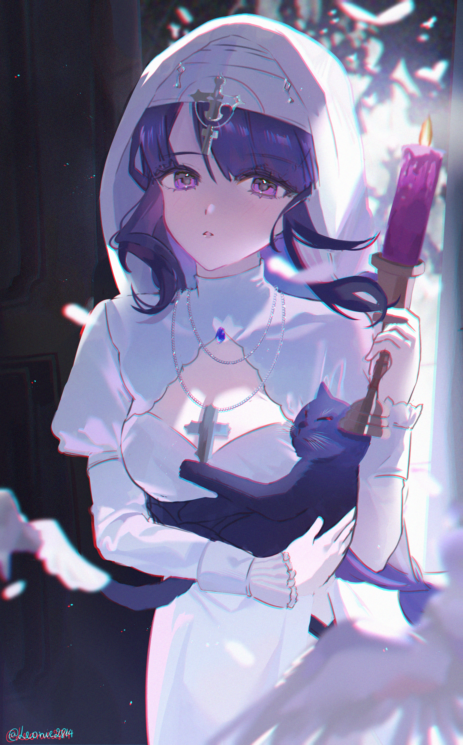 1girlalternate costumealternate universeanimalartist nameblunt bangsblurryblurry backgroundcandlecarryingcatcenter openingcrosscross necklacedepth of fielddressfeathered wingsfeathersfrilled dressfrilled sleevesfrillsgradient hairholdingholding animalholding candleholding catindoorsjewelrylong sleeveslooking at viewermulticolored hairnecklaceno molenunopen mouthpurple eyespurple hairshadesolostandingtwitter usernameupper bodyveilwhite dresswhite featherswhite veilwings