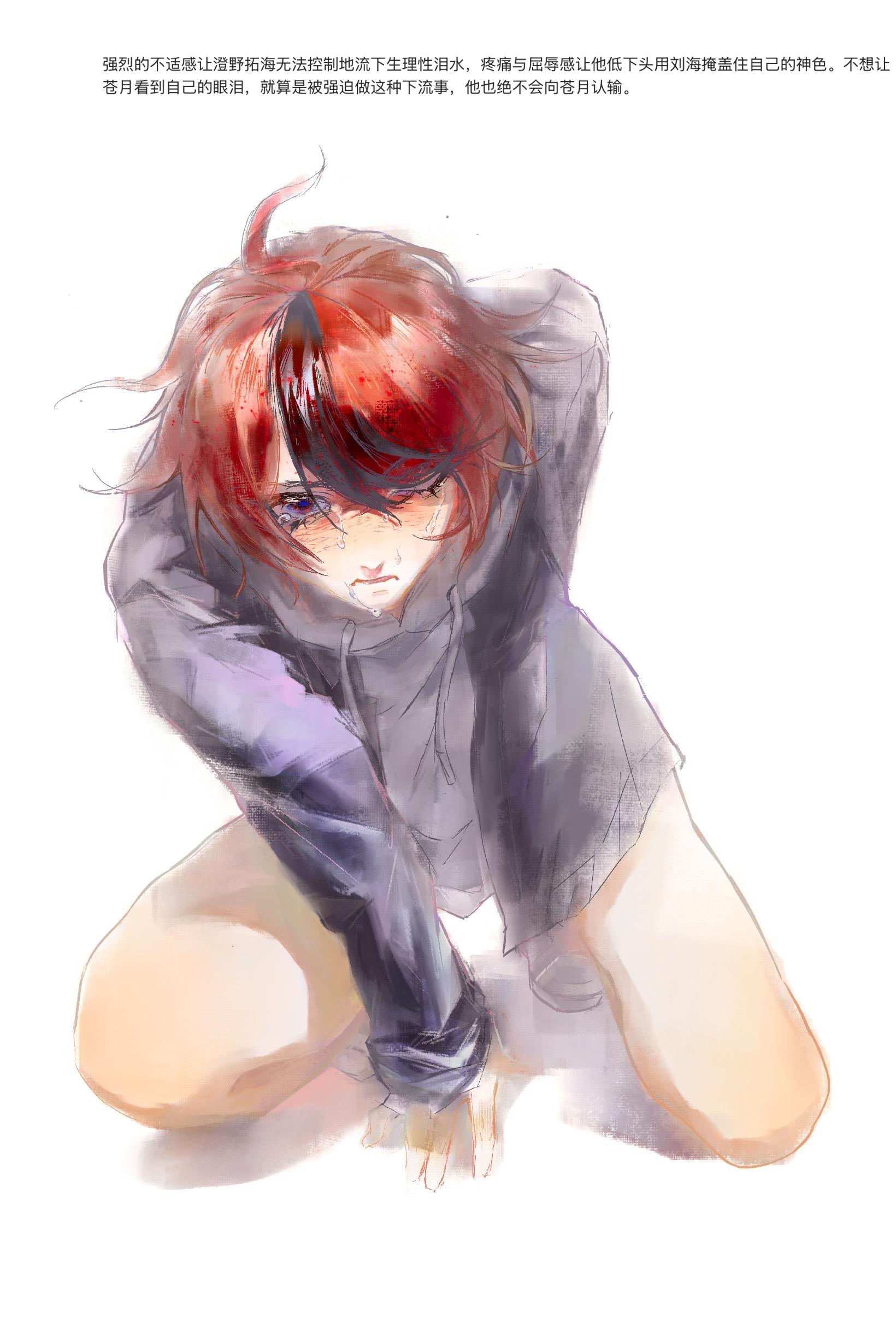 1boyahogeapiaoxuanshoublack hairblack jacketblue eyesblushchinese textcryingcrying with eyes openfull bodyhoodhood downhoodiejacketjacket over hoodiemale focusmulticolored hairno pantsone eye closedopen clothesopen jacketred hairshoesshort hairsimple backgroundsleeves past wristssolosquattingstreaked hairtearstwo-tone hairwhite backgroundwhite hoodiewhite shoes