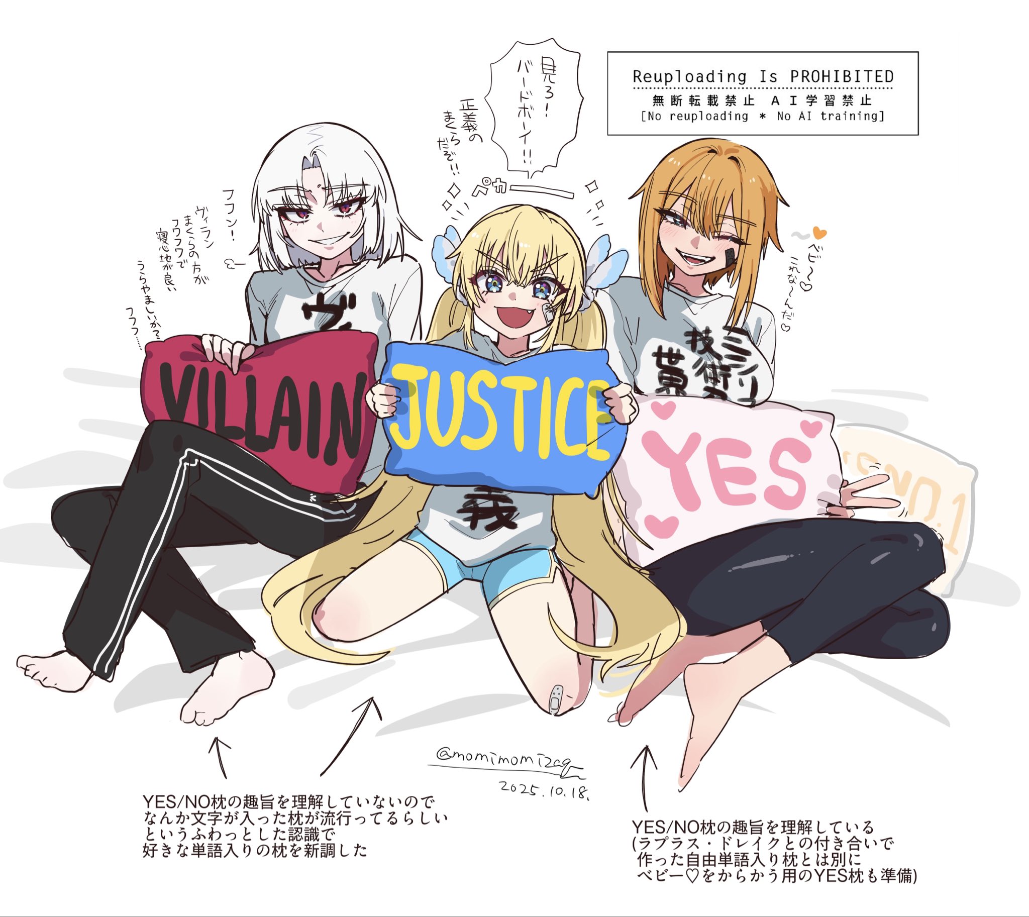 3girlsalternate costumebandaidbandaid on cheekbandaid on faceblonde hairblue eyesblushbreastscasualcontemporaryfangholdingholding pillowlarge breastslong hairlooking at viewermatis (nikke)multiple girlsopen mouthpillowred eyesshirtshort hairshort hair with long locksshortssidelockssmilet-shirttwintailswhite hairyes-no pillow