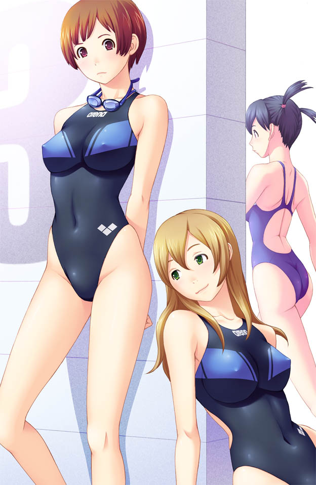 3girlsagainst wallarms behind backassbackblack hairblonde hairblue hairblushbreastsbrown eyesbrown haircompetition swimsuitcovered erect nipplescovered navelfrowngogglesgreen eyeshighleghighleg one-piece swimsuitlegslong hairmedium breastsmultiple girlsone-piece swimsuitpurple eyesrecliningshadowshiny clothesshort hairshort twintailssittingskin tightsmileswimsuittwintails