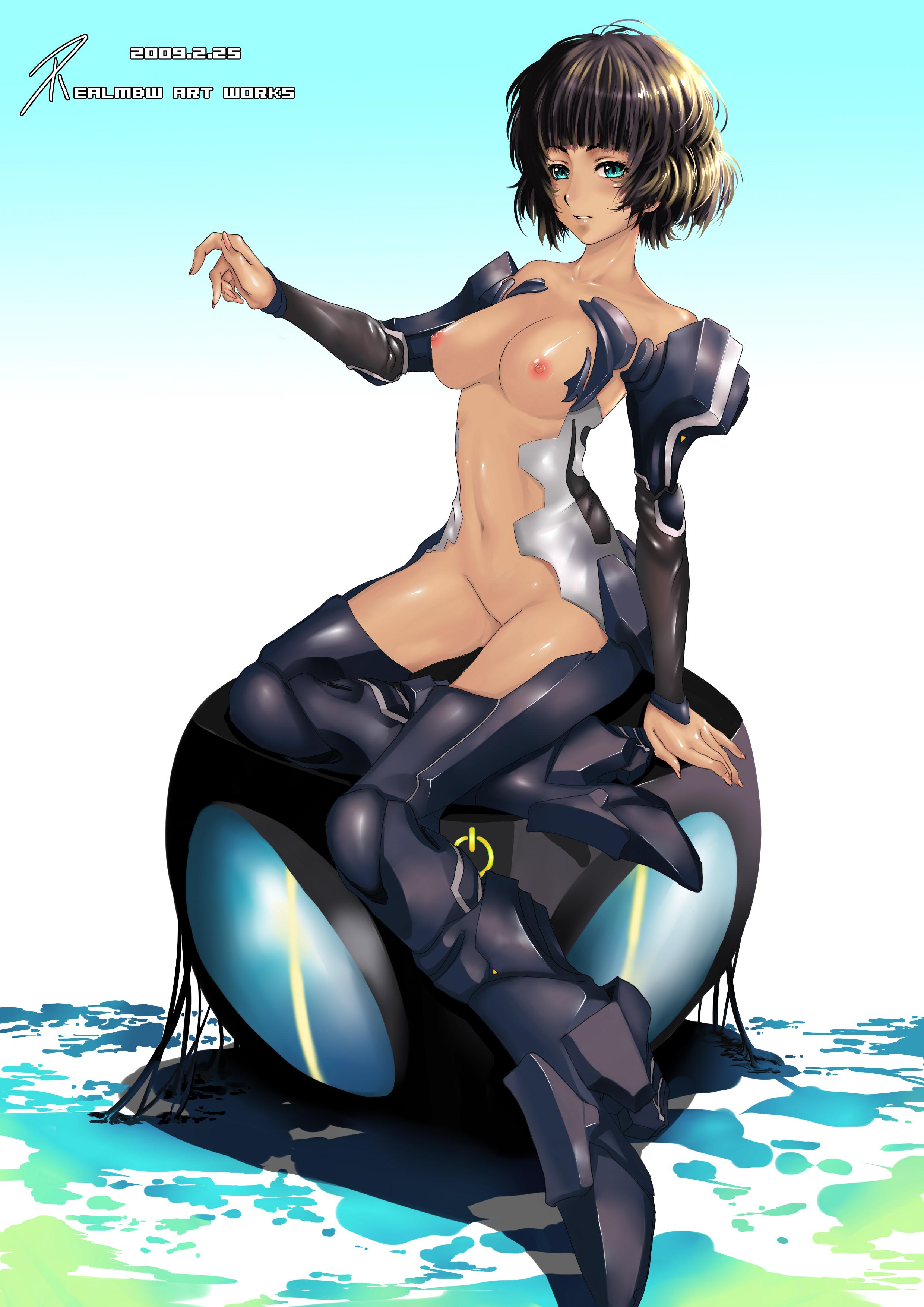 1girlaqua eyesarmorbare shouldersbreastsbrown haircovered erect nipplesdetached sleevesfemale focuslipsmedium breastsnavelnipplesno pantiesshort hairsittingsolotan