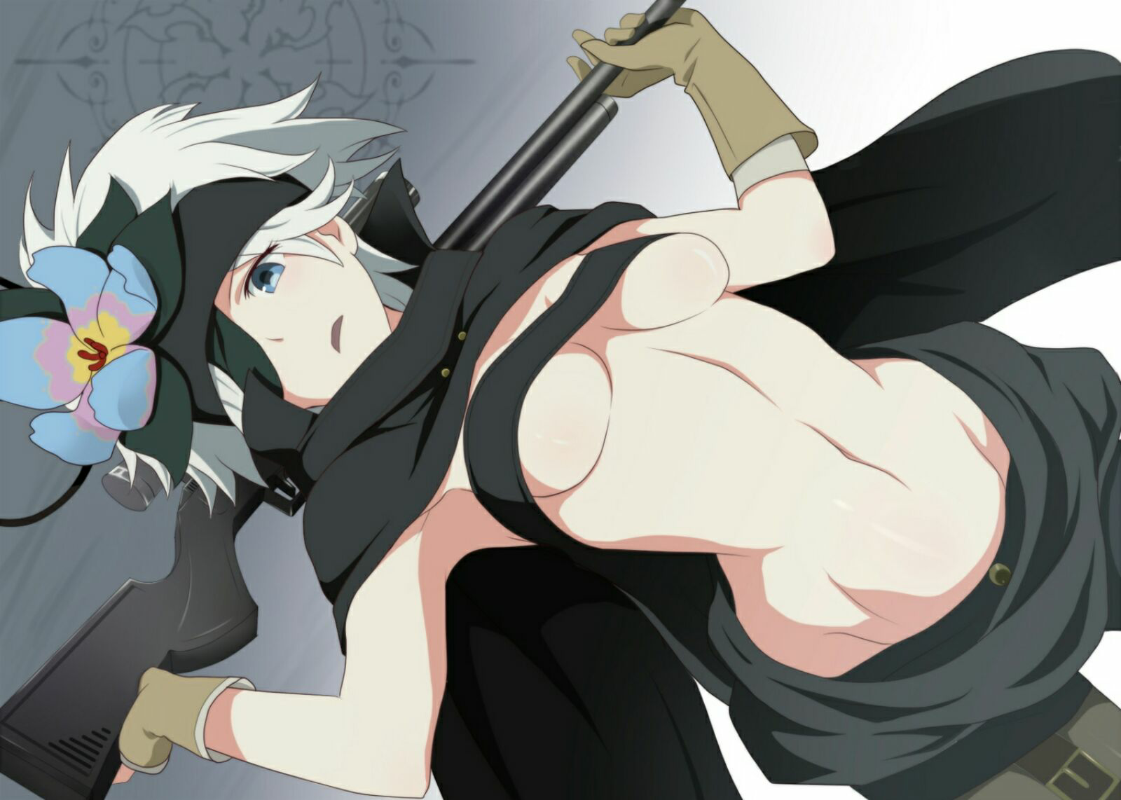 1girlsblue eyesfemalefemale onlyFlag for Deletionglovesnavelriflesolounderboobweaponwhite hair