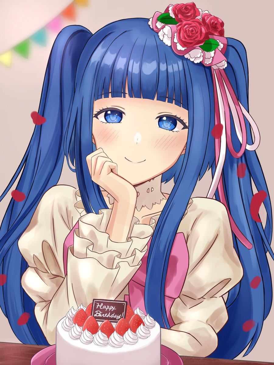 1girlbirthday cakeblue eyesblue hairblue pupilsblurryblurry backgroundblushbowcakechrome rclosed mouthdressflowerfoodfruithair flowerhair ornamentlong hairlooking at viewerpink bowred flowerred roserosesmilesolostrawberrystreamerstwintailswhite dress