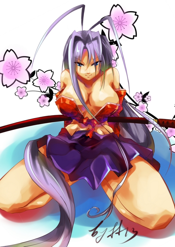 1girlantenna hairbare shouldersblue eyesbreastscleavagefemale focusjapanese clotheskatanakneelinglarge breastslong hairlooking at viewerminiskirtno brapurple hairsimple backgroundskirtsmilesoloswordweaponwhite background