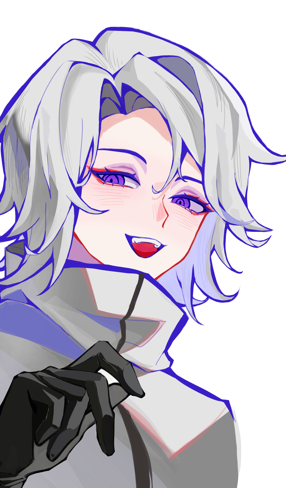 18370557171boyalternate hairstyleblack glovesdowncast eyesevil grinevil smileeyelinerglovesgrey hairgrinjacketlooking at viewermakeupmale focusno eyewearpurple eyesred eyelinershort hairsimple backgroundsmilesoloteethupper bodyupper teeth onlywhite backgroundwhite jacket