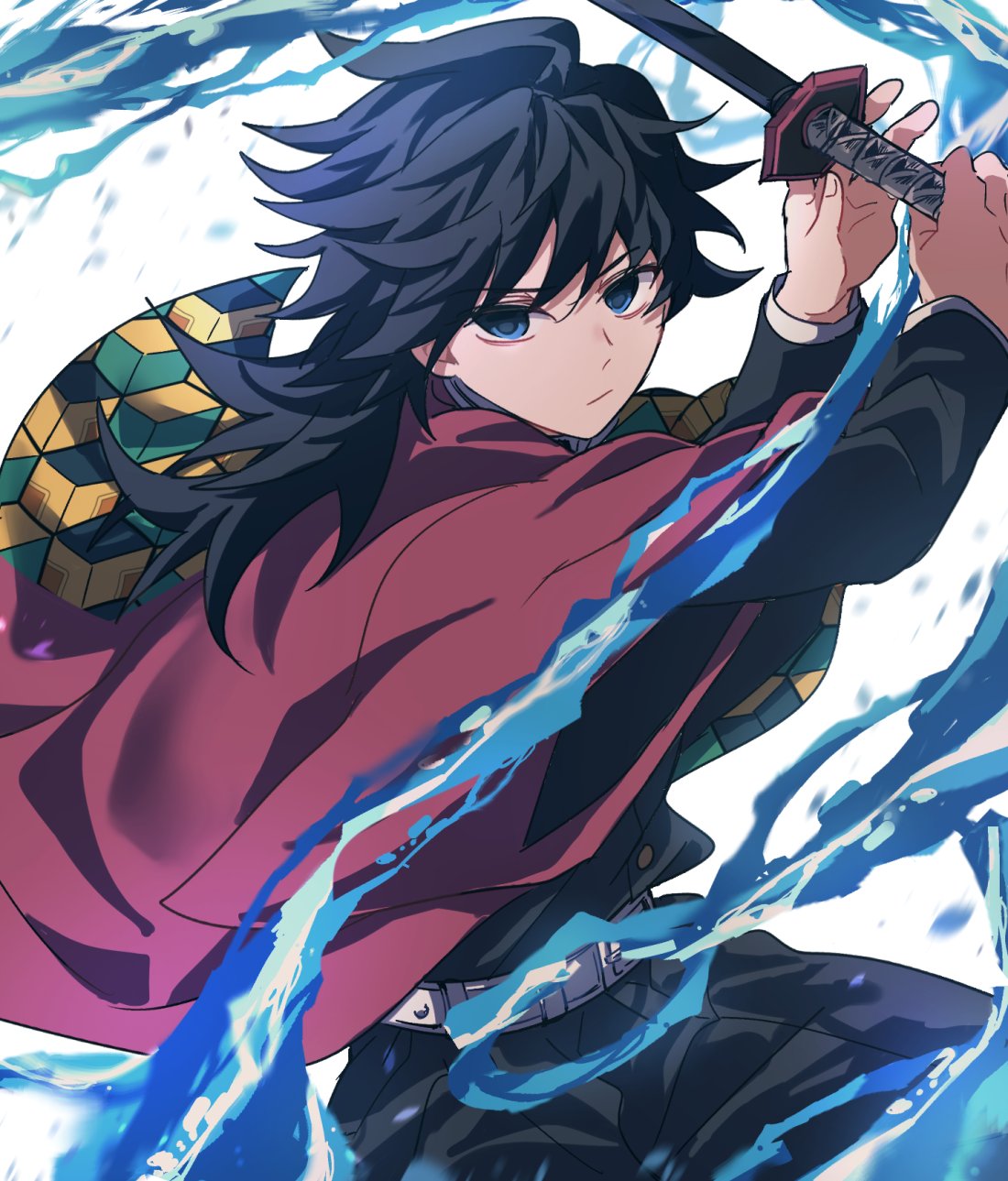 1boybeltblack hairblack jacketblack pantsblue eyesbuttonsclosed mouthdemon slayer uniformdok9uuuempty eyesgold buttonshair between eyeshaorihigh collarholdingholding swordholding weaponjacketjapanese clotheskatanakikkoumonlooking at viewerlow ponytailmale focuspantsponytailprint haorired haorisolospiked hairswordwaterweaponwhite belt
