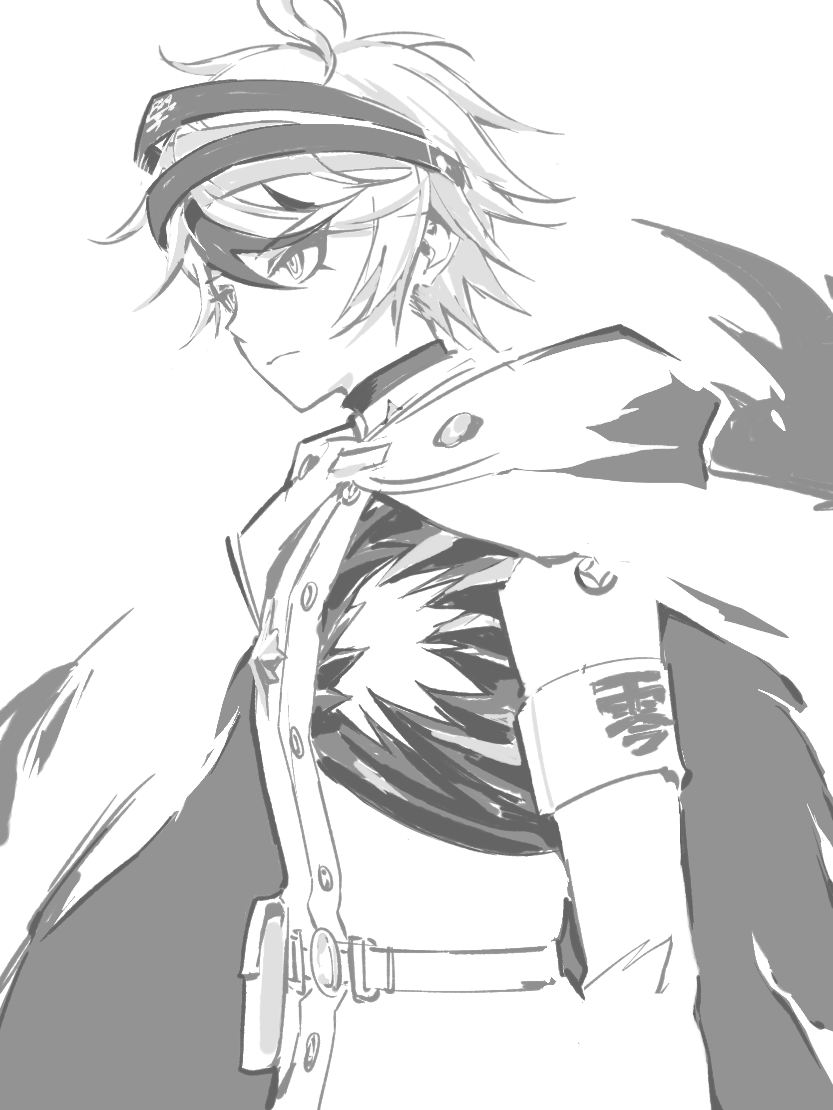 1boybeltbelt pouchbuttonscapeclosed mouthfrom behindgreyscalehair between eyesjacketlast defense academy school uniformlong sleevesmale focusmonochromemulticolored hairpouchschool uniformshort hairsimple backgroundsolostreaked hairtsurimetwo-tone hairupper bodywhite background
