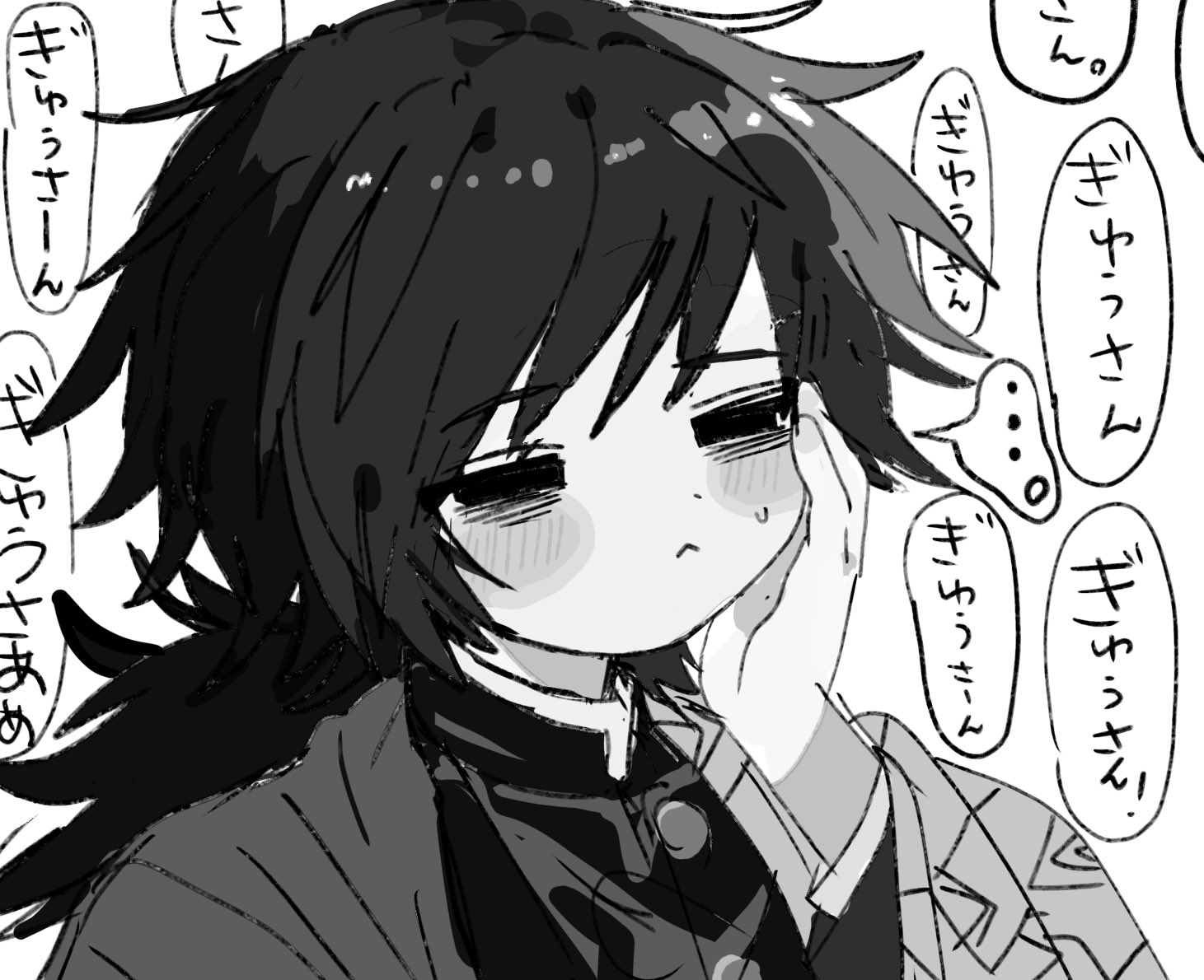 1boyblush stickersbuttonsclosed mouthdemon slayer uniformhalf-closed eyeshand uphaorihigh collarjapanese clotheskikkoumonlong hairlow ponytailmale focusponytailprint haorisimple backgroundsolospeech bubblespiked hairsweatdropupper bodyusisandaowhite background