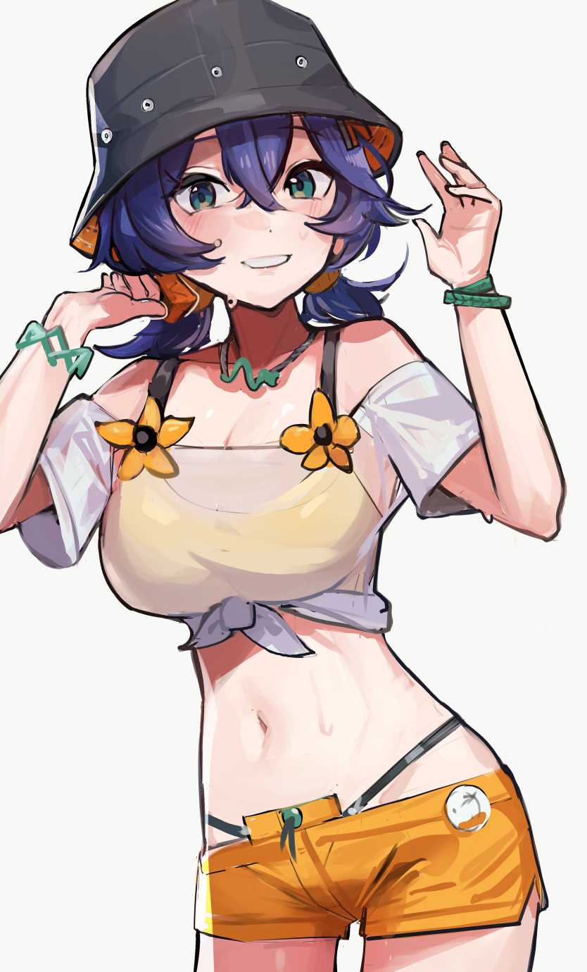 1girlbikiniblack hatblue hairbraceletbreastsbucket hatcleavagecollarbonegreen eyeshair between eyeshatjewelrylarge breastslooking at viewermedium breastsnavelnecklaceofficial alternate costumeorange shortsshirtshort hairshort twintailsshortssolosweatswimsuittied shirttwintailswhite shirt