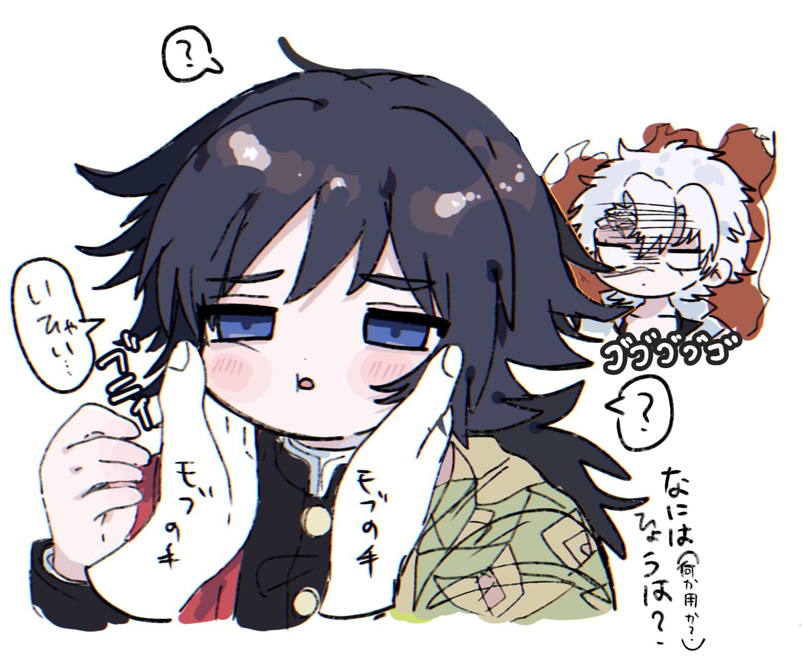 1boy2boysblack hairblack jacketblue eyesbuttonschibidemon slayer uniformfingernailsgold buttonsgrey hairhaorihigh collarjacketjapanese clotheskikkoumonlow ponytailmale focusmultiple boysparted lipsponytailprint haorired haorisimple backgroundspeech bubblespiked hairspoken question markusisandaowhite background
