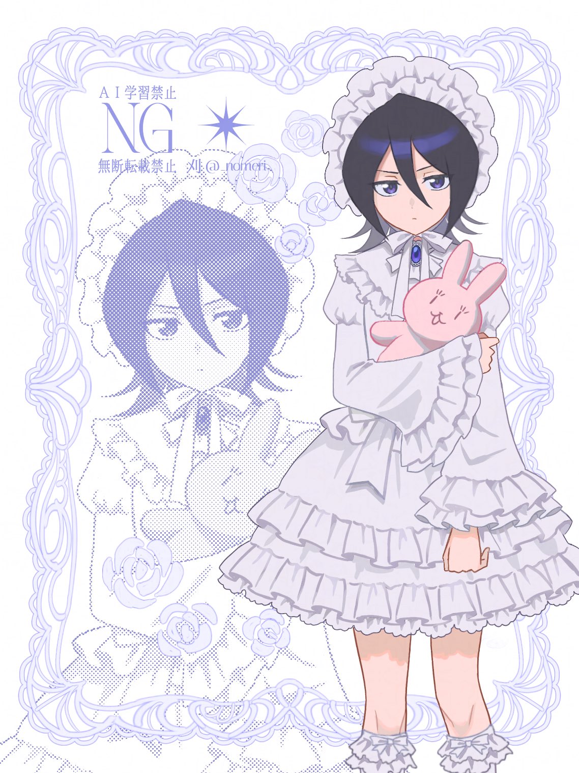 1girlblack hairclosed mouthdressfrilled dressfrillshair between eyesholdingholding stuffed toylong bangslong sleeveslooking at viewerpurple eyesshort hairsolostuffed animalstuffed rabbitstuffed toytwitter usernamewhite dress