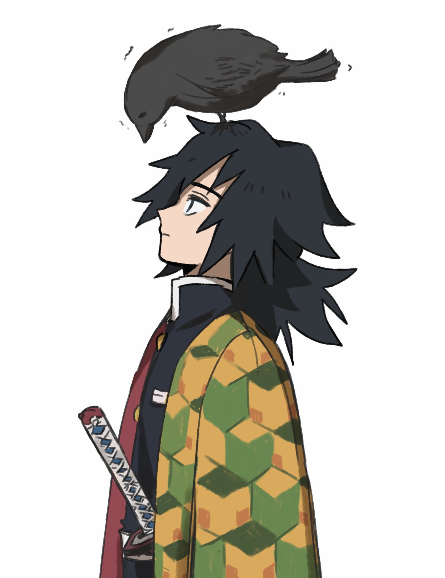 1boyanimalanimal on headbeltbirdbird on headblack hairblack jacketblack pantsblue eyesbuttonsclosed mouthcrowdemon slayer uniformgold buttonshaorihigh collarjacketjapanese clotheskatanakikkoumonlooking uplow ponytailmale focuson headpantsponytailprint haoriprofilered haorisimple backgroundsolospiked hairswordweaponwhite backgroundwhite belt