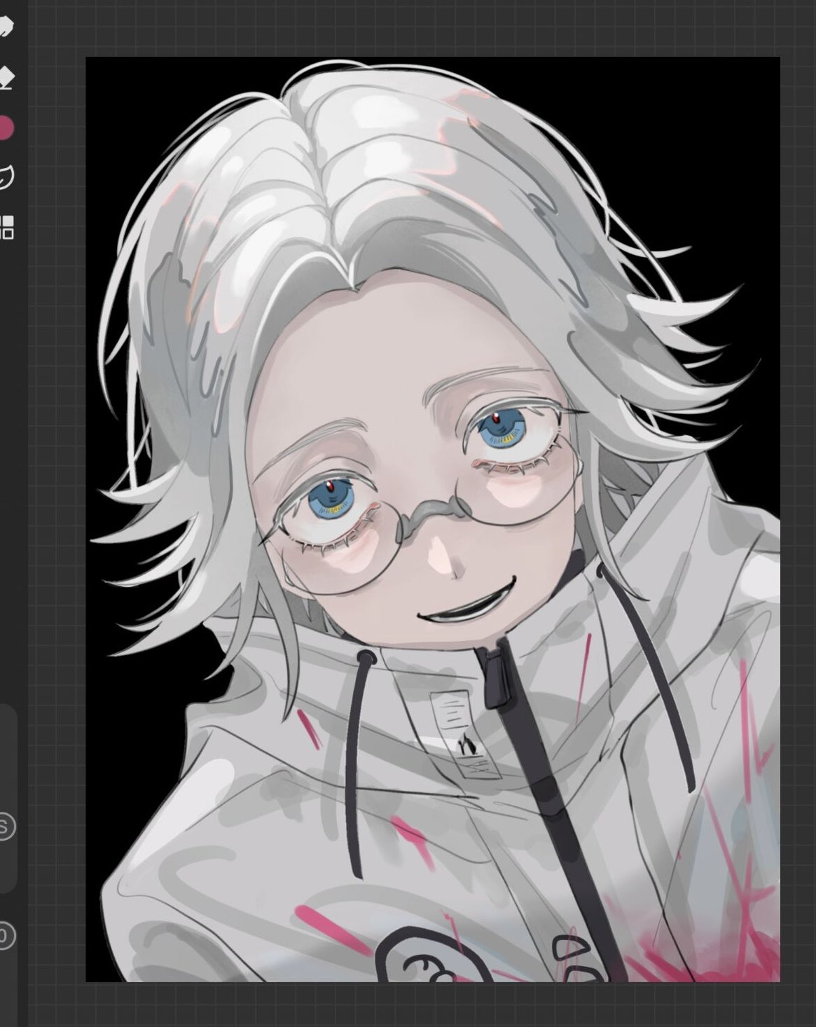 1boyart program in frameblack backgroundbloodblood on clothesblue eyesccc48271292drawstringdutch angleeyelashesglassesgrey hairgrinjacketlooking at viewerlooking over eyewearmale focusopen mouthpink bloodsemi-rimless eyewearshort hairsmilesolowhite jacket