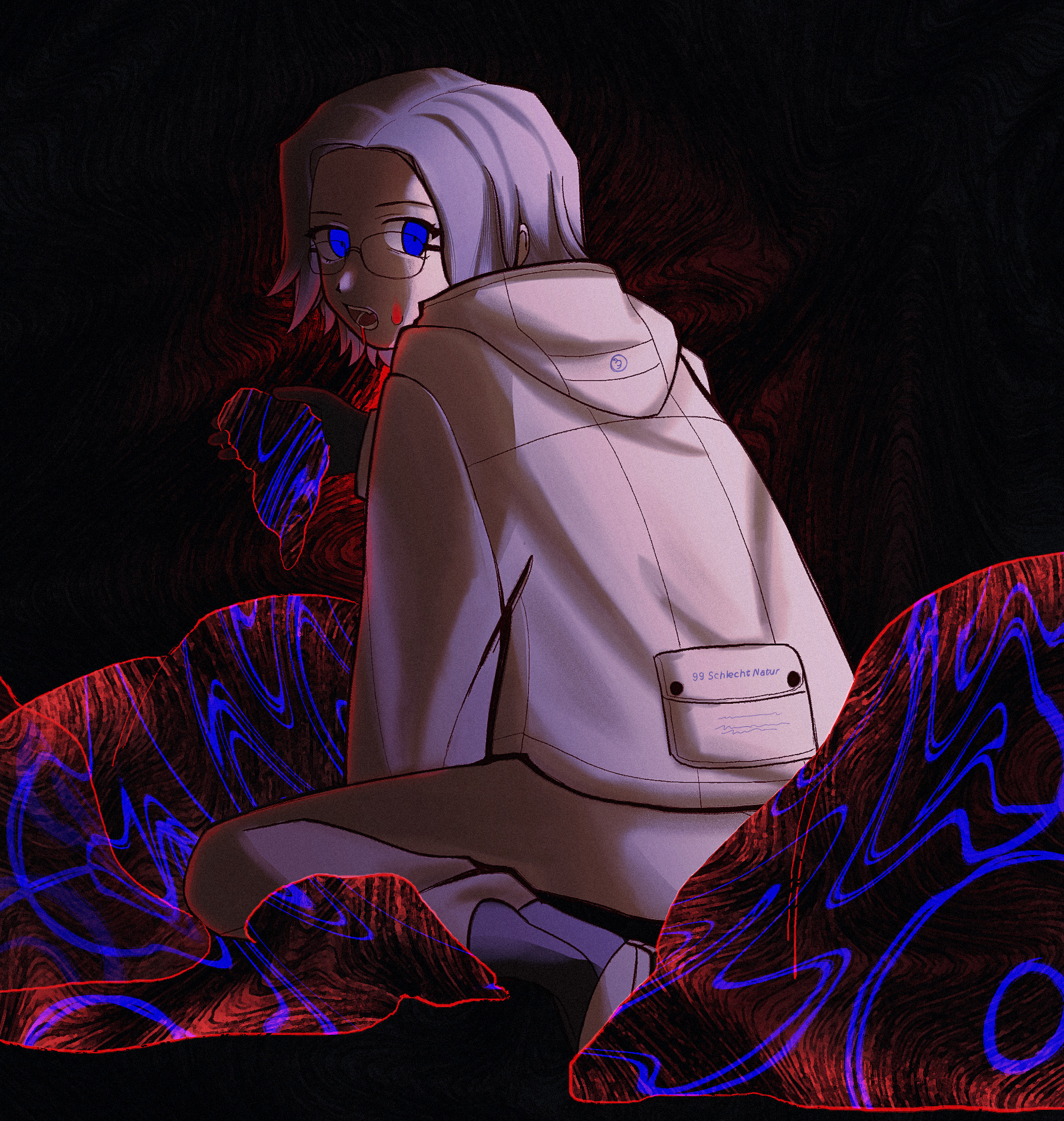 1boyblack glovesblack shoesbloodblood on faceblue eyeseatingfleshfrom behindglassesglovesgrey hairholdinghorror (theme)jacketlooking at viewerlooking backmale focuspantspsy chorusshoesshort hairsittingsolowarizawhite jacketwhite pants