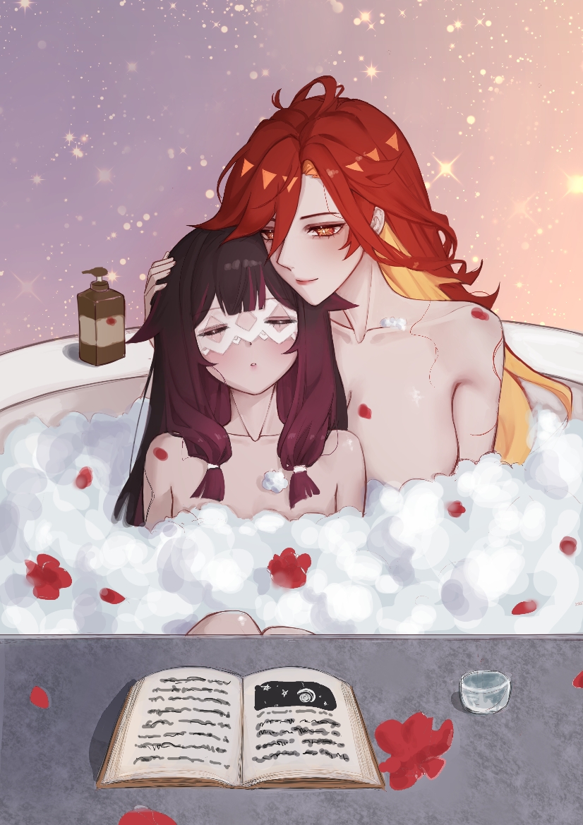 2girlsahogebathbathtubblonde hairbookbrown hairbubble bathcupdrinking glassflowerhand on another's headlipsticklooking at anothermakeupmulticolored eyesmulticolored hairmultiple girlsnudeopen bookorange eyesorange hairpetalspink lipspurple hairred flowerred roseroserose petalsselenium (reg no 06089)shampoo bottleshared bathingshot glasssmilesoap bottlestreaked hairswept bangsyellow eyesyuri