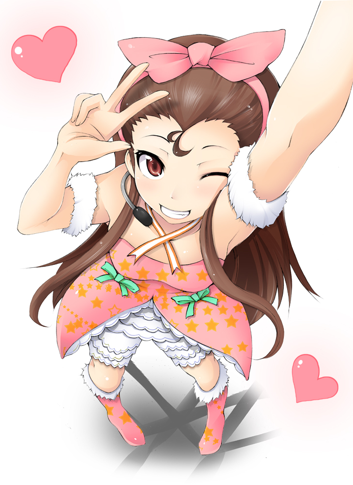 kanipoposu, yumemi riamu, idolmaster, idolmaster cinderella girls, idolmaster cinderella girls starlight stage, absurdres, commentary, highres, 1girl, ahoge, apron, aqua hair, aqua ribbon, aqua sleeves, blush, breasts, closed mouth, detached sleeves, fanged bangs, frilled apron, frills, hair intakes, hair ornament, hair ribbon, hair rings, heart, heart hair ornament, heart in eye, jacket, jersey maid, large breasts, long sleeves, looking at viewer, maid, maid headdress, medium hair, multicolored hair, pink background, pink eyes, pink hair, pink jacket, ribbon, solo, symbol in eye, two-tone hair, unconventional maid, white apron
