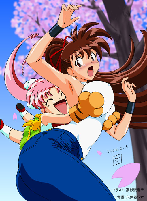 1990s (style)2girlsage differenceanimal handsarmpitsassblushbreastsbrown eyesbrown haircherry blossomsclosed eyescovered erect nipplesdaydenimglovesgrabbing another's breastgropinghair ribbonjeanslarge breastslong hairmultiple girlsopen mouthoutdoorspantspaw glovespetalspink hairponytailretro artstyleribbonskirtsockssurprisedsurprised armstreetwintailsvery long hairwristband