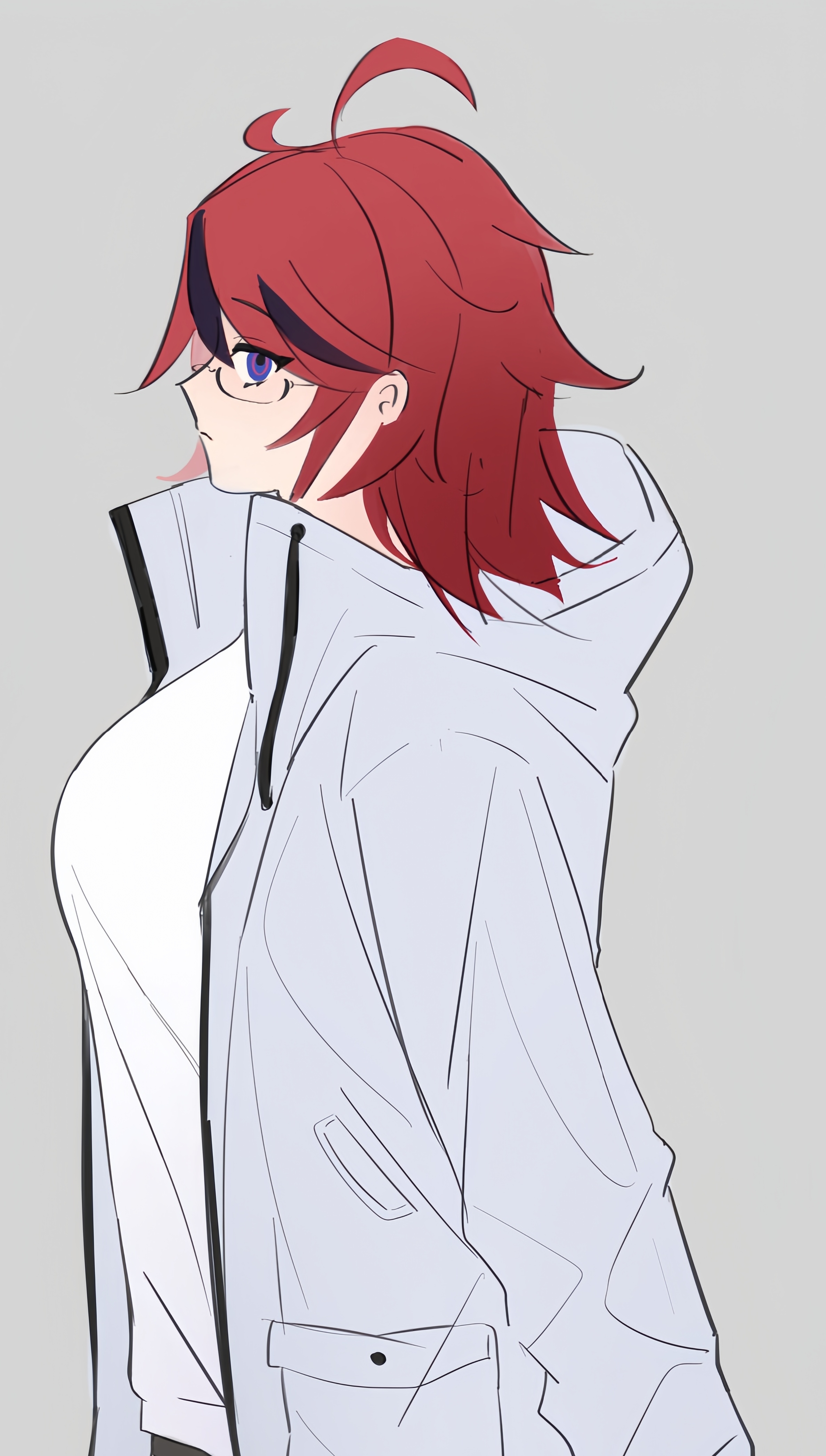 1girlahogeaotsuki eito (cosplay)black hairblue eyesclosed mouthcosplaygenderswapgenderswap (mtf)glassesgrey backgroundgrey jacketjacketjiang263medium hairmulticolored hairopen clothesopen jacketred hairsemi-rimless eyewearshirtsimple backgroundsolostreaked hairtwo-tone hairwhite shirt
