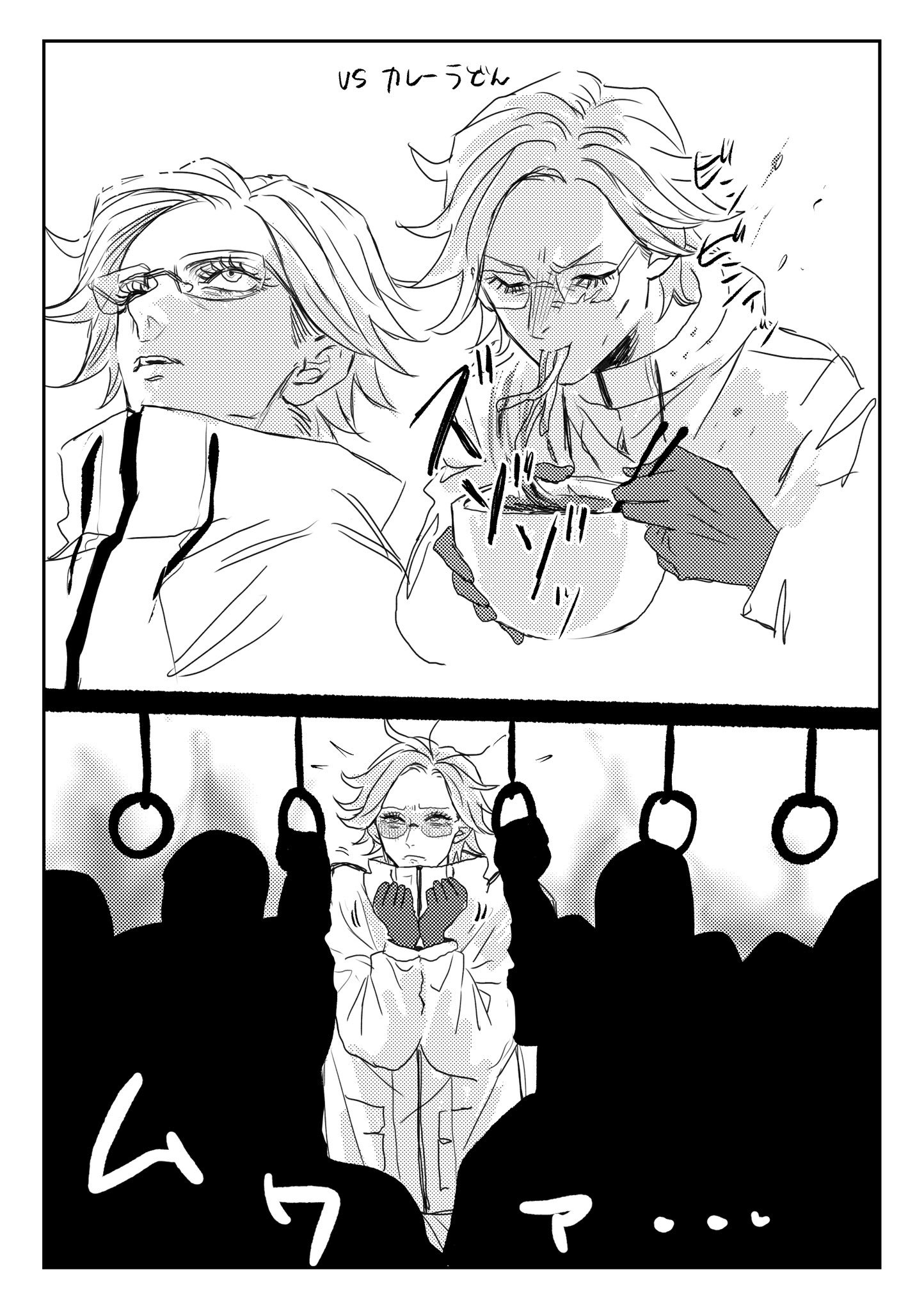 1boyben-day dotsbowlchopsticksclosed eyescrowdeddogusarealieneatingfoodglassesglovesgreyscaleholdingholding bowlholding chopsticksjacketlooking upmale focusmonochromemultiple viewsnoodlesscreentonesshort hairsouptrain interiorudon