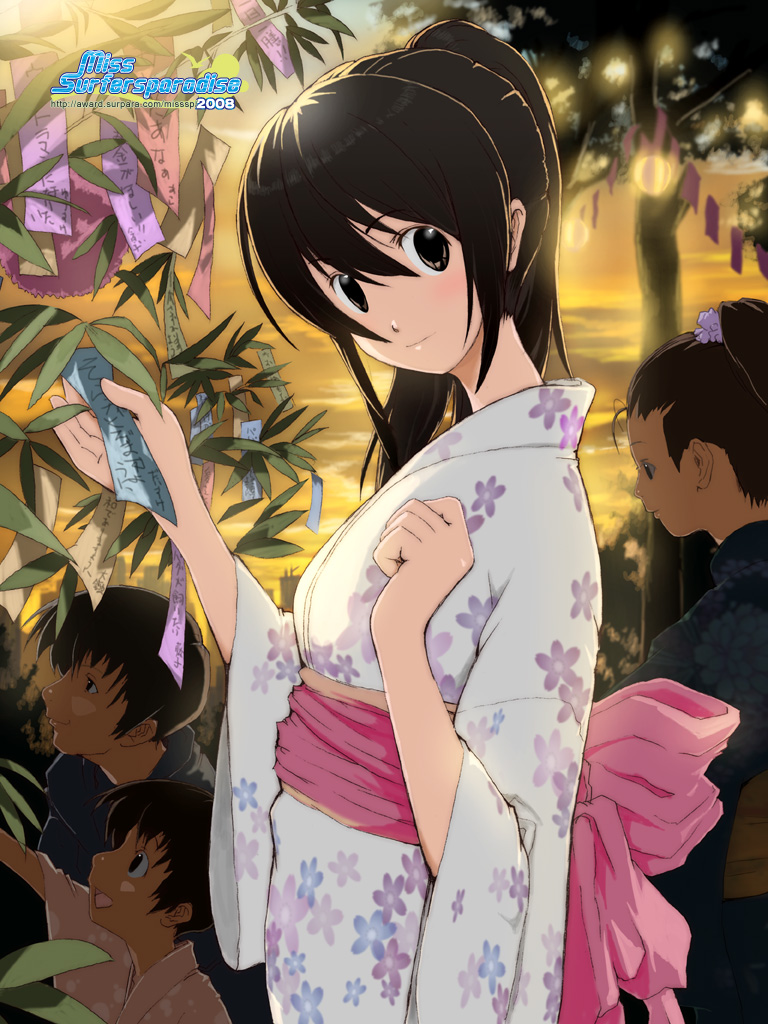 1girlblack eyesblack hairfemale focusfloral printjapanese clotheskimonolong hairponytailprint kimonosolosunsetwhite kimonoyukata