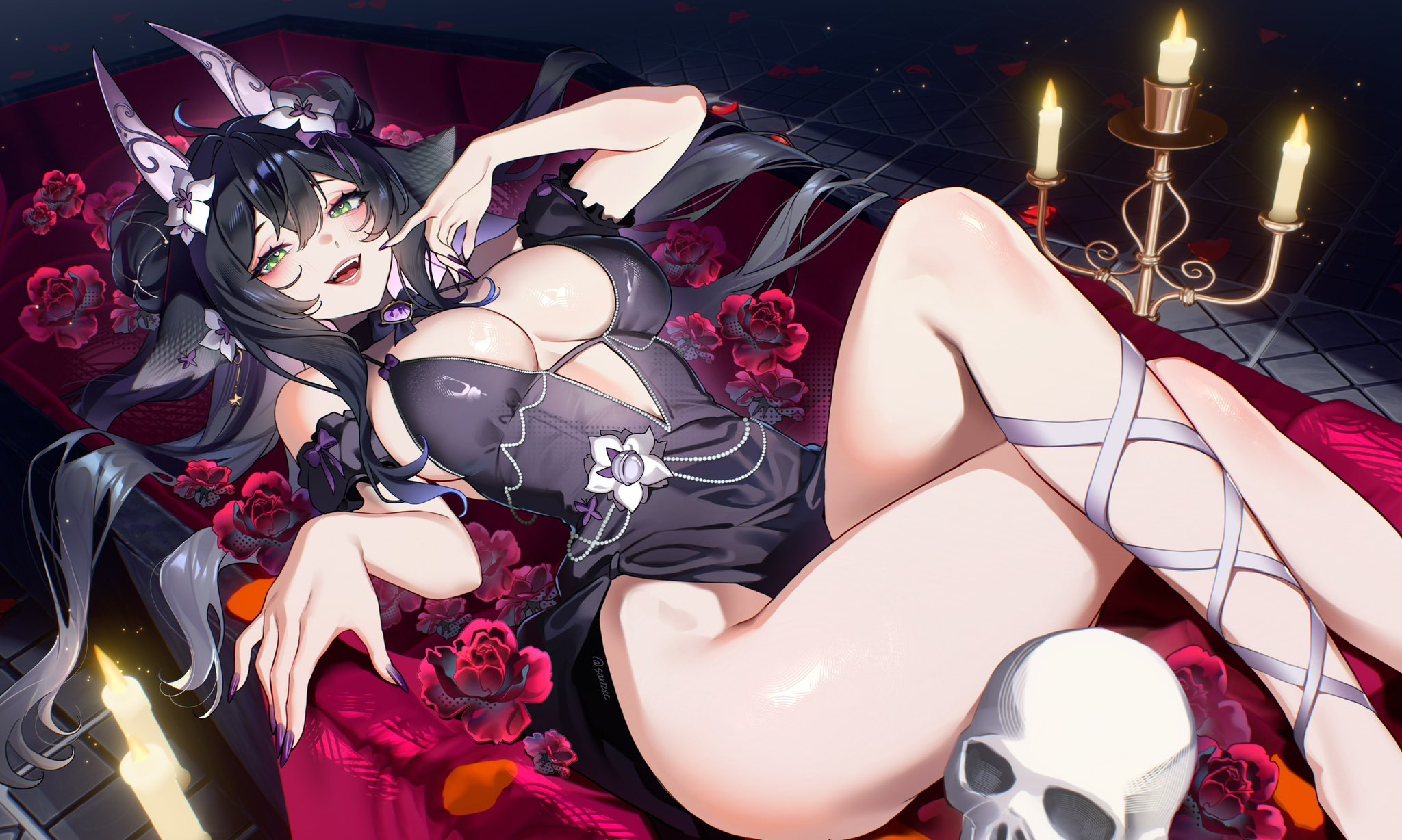 noeee, takanashi kiara, hololive, hololive english, highres, 1girl, black nails, breasts, cleavage, gradient hair, grin, large breasts, looking at viewer, multicolored hair, official alternate costume, orange hair, purple eyes, simple background, smile, solo, thighhighs, virtual youtuber, white background, zettai ryouiki