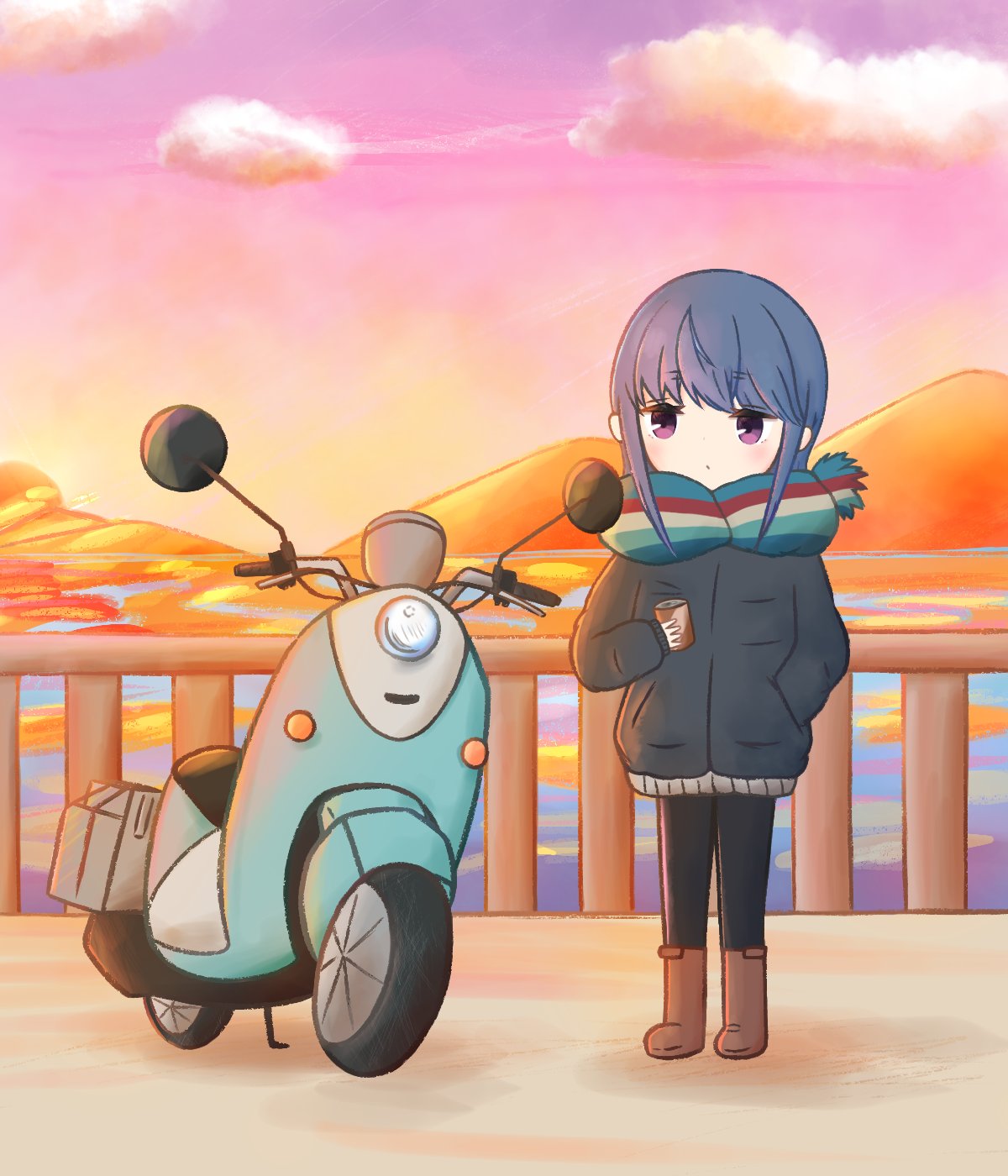 1girlautumnbirthdayblack pantsblue hairblushbootscancanned coffeecoatdaydrink canfemale focusfull bodyholdinglong sleevesmopedmotor vehiclemountainpantspurple eyesscarfsceneryscooterskysolostandingsunsetwaterwinter clotheswinter coat