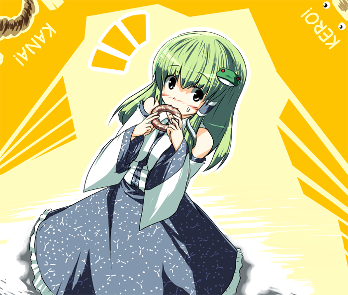1girlblushdetached sleevesdonuteatingfemale focusfoodfrog hair ornamentgreen hairhair ornamenthair tubeslong hairlooking at viewersnake hair ornamentsolosweatdrop